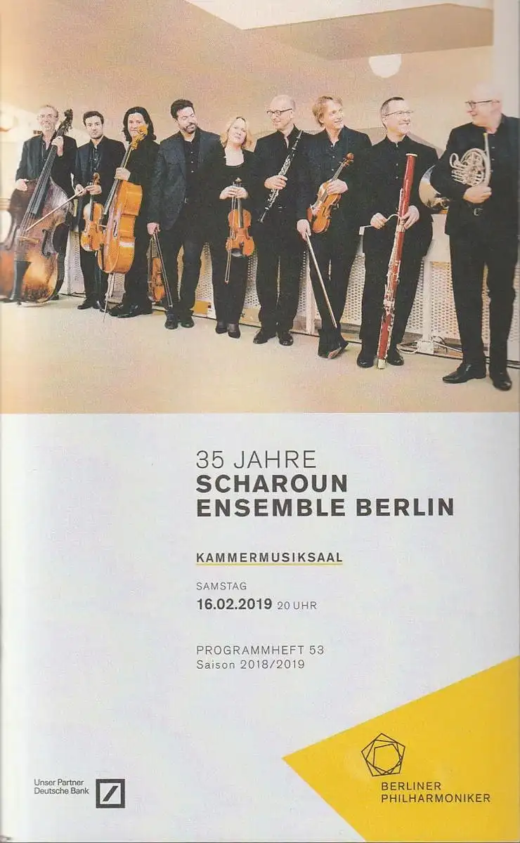 Berliner Philharmoniker, Kirsten Peters, Markus Zint, Hendrikje Scholl, Harald Hodeige, Gerhard Forck: Programmheft 35 JAHRE SCHAROUN ENSEMBLE BERLIN 16.Februar 2019 Kammermusiksaal Saison 2018 / 2019 Heft 53.