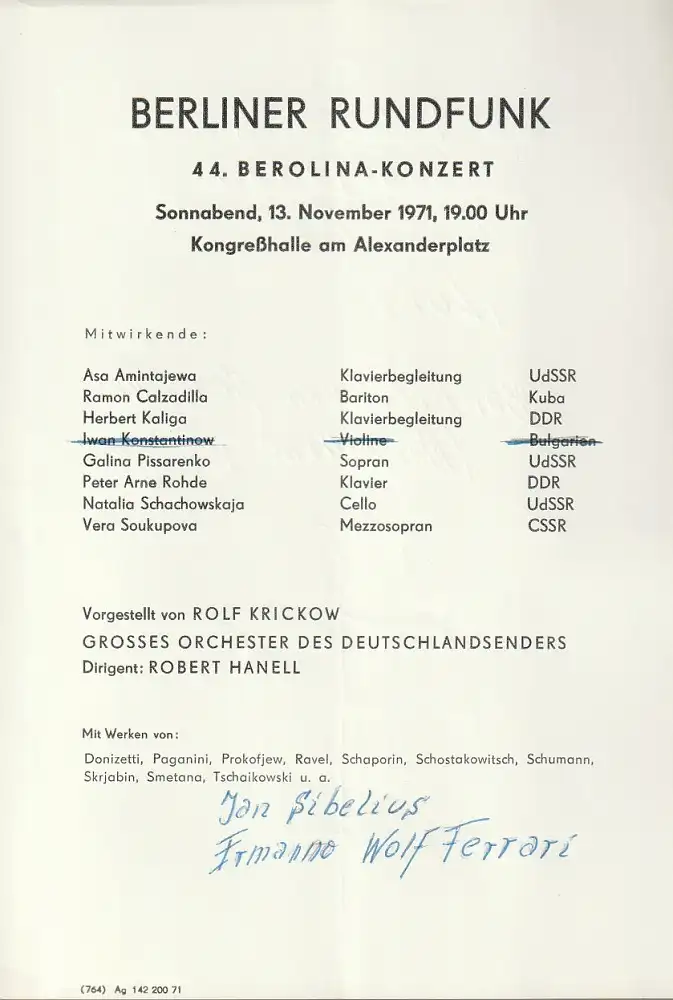 Berliner Rundfunk: Theaterzettel BERLINER RUNDFUNK 44. BEROLINA-KONZERT 13. November 1971 Kongreßhalle am Alexanderplatz.
