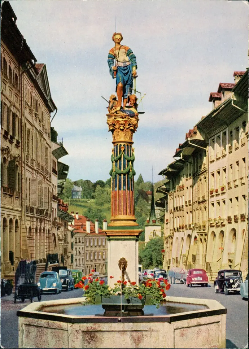 Bern (Schweiz) Berne Gerechtigkeitsbrunnen, Autos u.a. blauer VW Käfer 1957