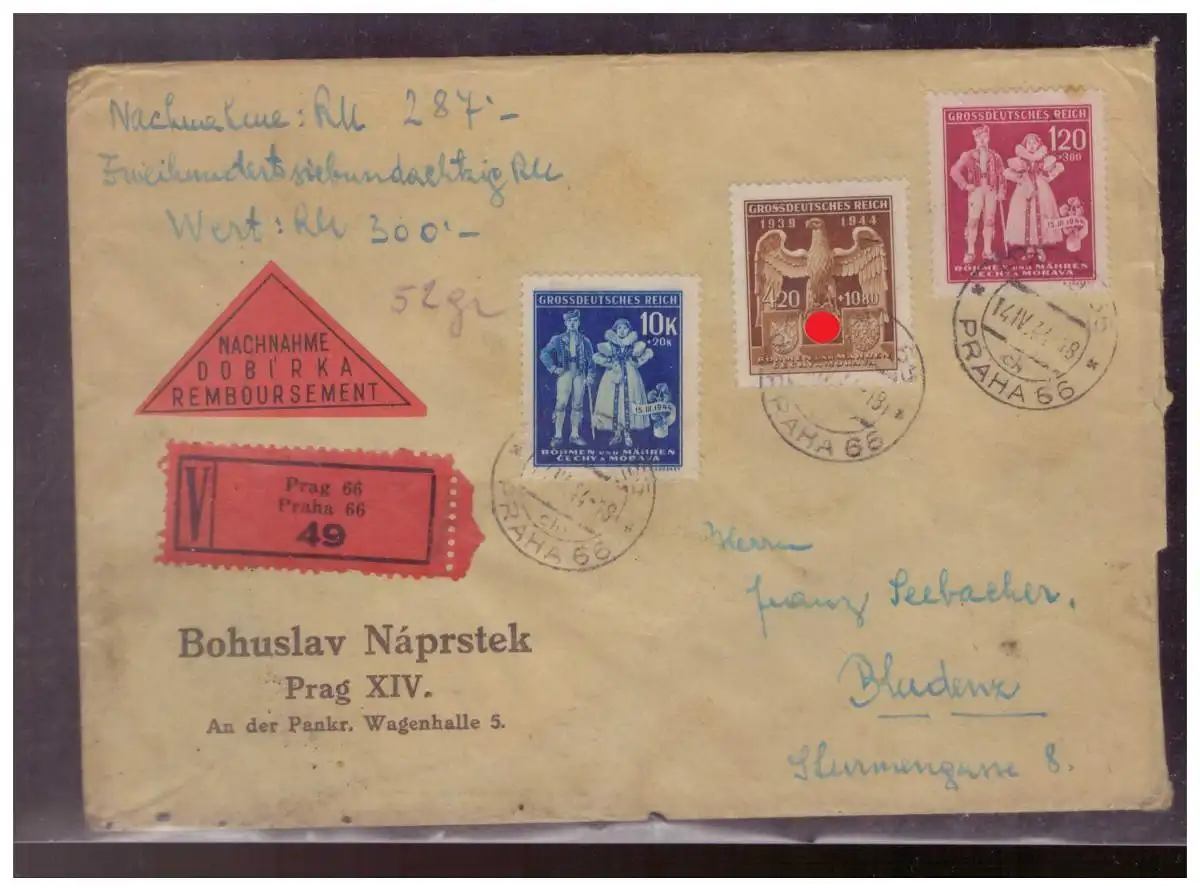 BM (009074) Wertbrief Nachnahme Rückseite gesiegelt gelaufen Prag 1944 mit Inhalt