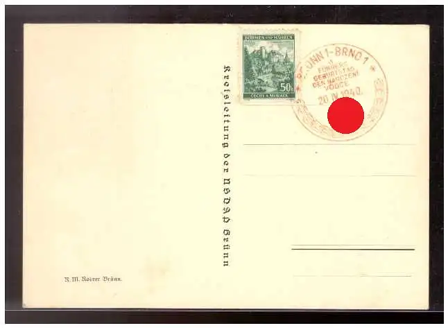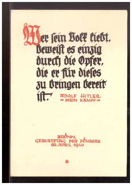 BM (021521) Propaganda Spruchkarte Brünn zum Geburtstag des Führers 20.4.1940, banco mit SST Brünn 20.4.1940