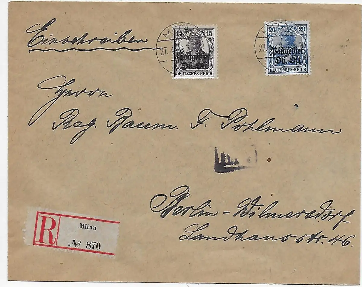 Besetzung I. WK Polen: Einschreiben Mitau nach Berlin-Wilmersdorf 1918