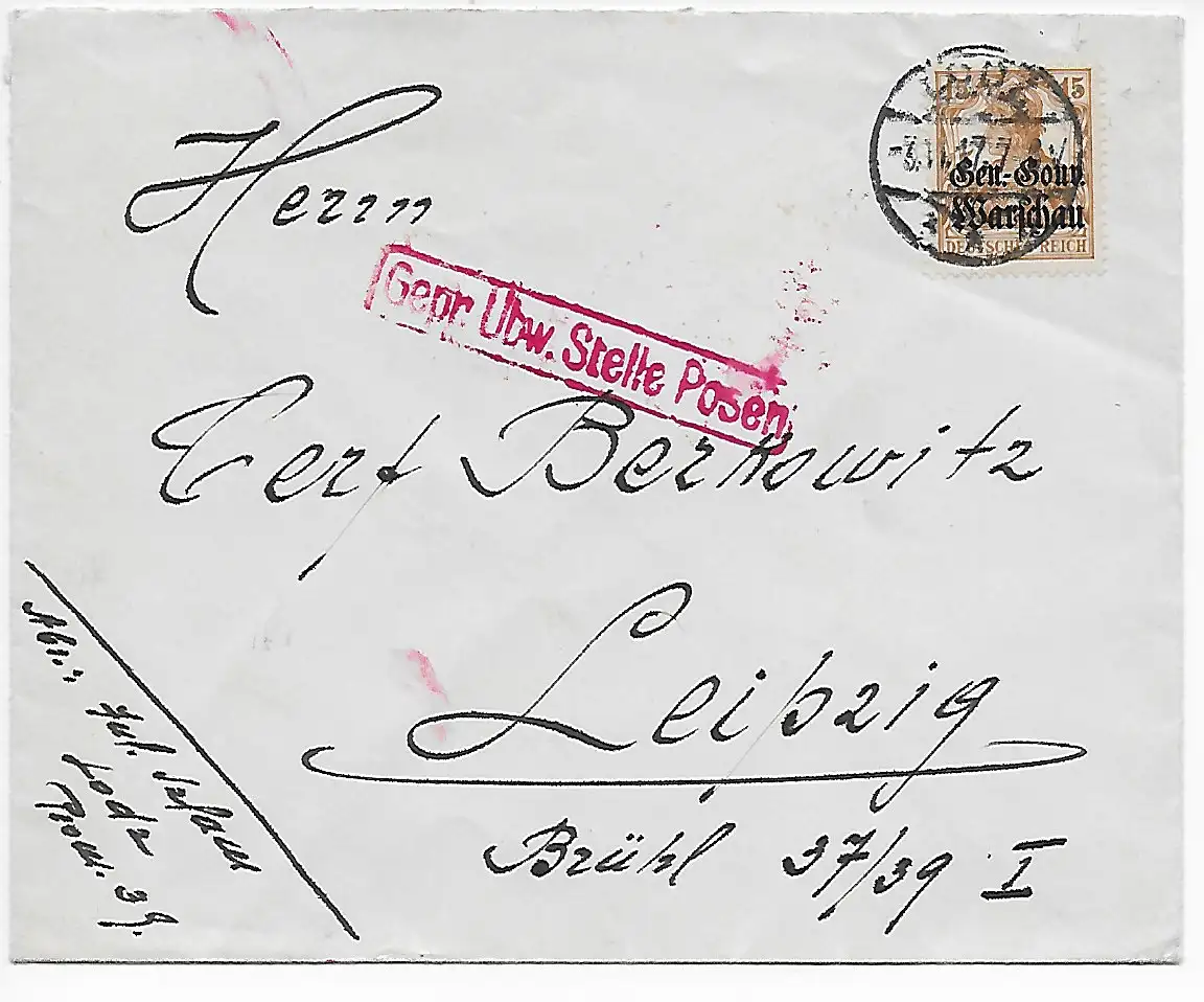 Besetzung I. WK Warschau: Lodz nach Leipzig, Zensur Posen 1917