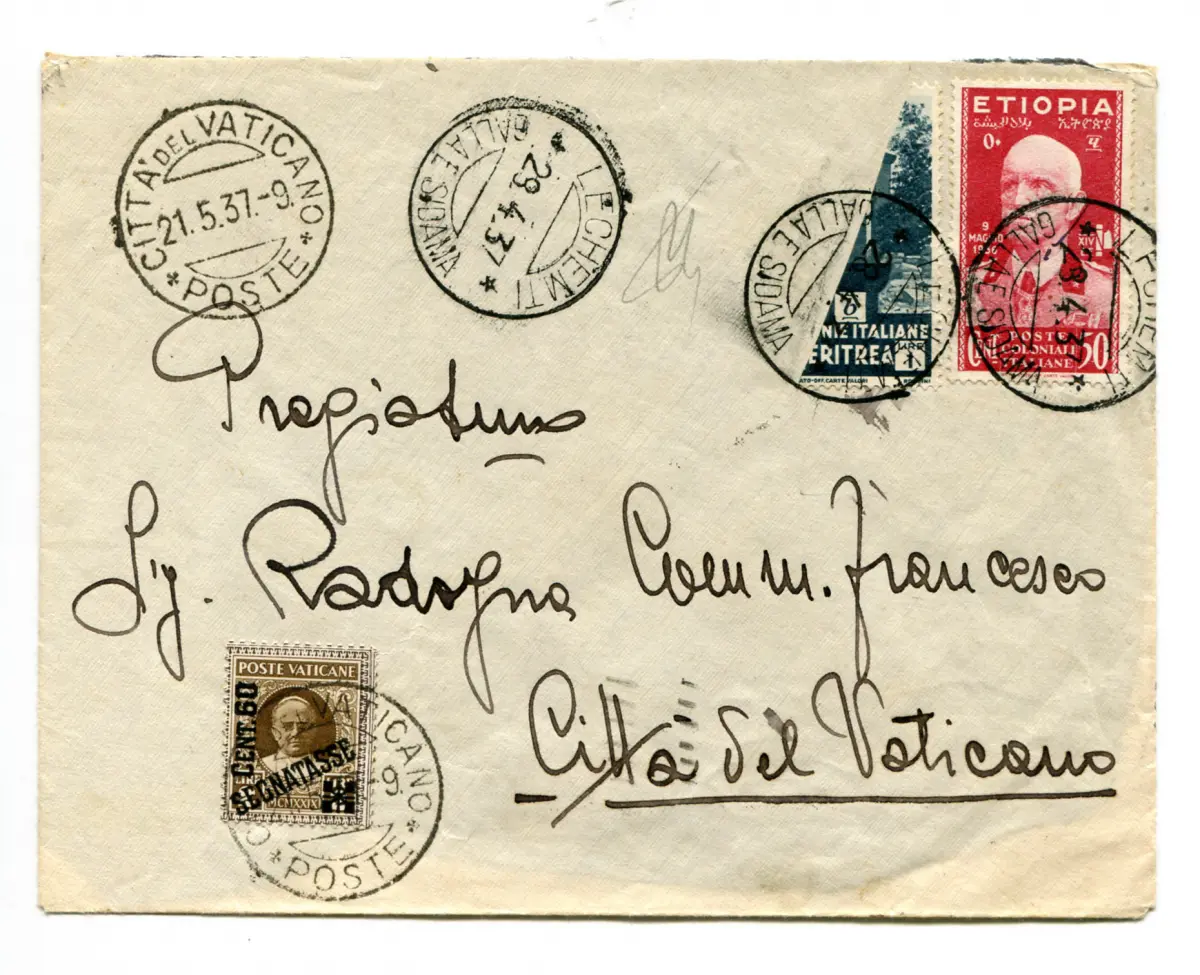 Besteuert - Umschlag aus Ostafrika mit Äthiopien + Fraktionierung von Eritrea - Besteuert - Umschlag aus Ostafrika am 29.4.37 (Lechemti Galla und Sidama) frankiert mit Äthiopien und eine am 21.5.37 besteuerte Teilmarke aus Eritrea in den Vatikan mit Steuermarken von Cent. 60 Nr. 5 - Selten für Fachleute, sehr wertvoll auch bei Abstornierung Code 846/8