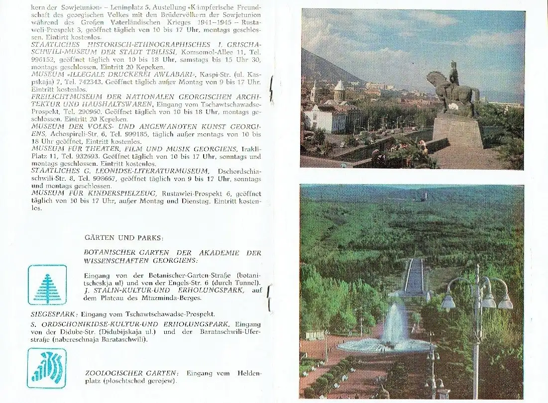 sehr guter Zustand, geringe Gebrauchs- und Alterungsspuren: teils leicht knittrig, Werbe-Prospekt mit Beschreibung und Informationen zu Tbilissi (Grusinische SSR), mit kleinem Innenstadtplan, Infos zu Unterbringung, Verkehrsmitteln, Autowerkstätten, Unterhaltung, Kinos, Museen, Gärten und Parks, Sport, Geschäfte, Märkte etc, Papier, ca. 14 x 21, 18 Seiten mit 10 Bildern