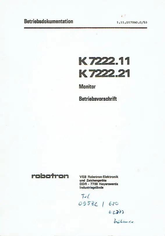 guter Zustand, Gebrauchs- und Alterungsspuren: Rücken etwas beschabt - Umschlag und Seiten teils etwas eselsohrig, Einleitung - Sicherheitsmaßnahmen - Erstinbetriebnahme - Wartung und Reparatur - Lagerung und Transport - Anlagen - Monitor K 7222.11 - Monitor K 7222.21 - Ersatzteilliste - 3 Beilagen K 7222.21 - Serviceschaltplan - Technische Beschreibung 1 + 2, kartoniert, ca. 14,5 x 20,5, 24 Seiten mit 12 Bildern + 3 Beilagen auf Mikroplanfilm
