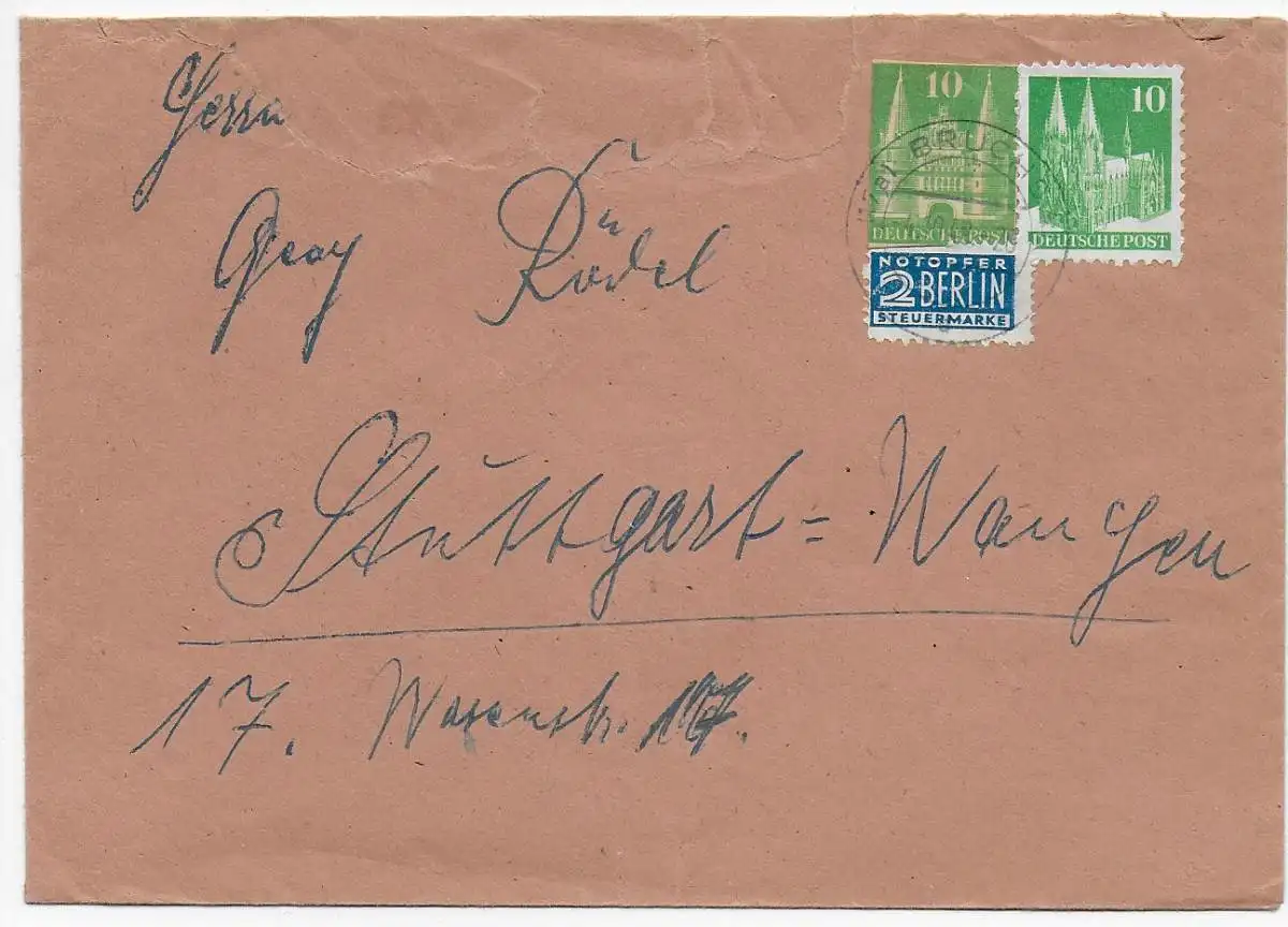 BiZone: Brief aus Bruchsal mit Ganzsachenausschnitt und Zusatzfrankatur 1948