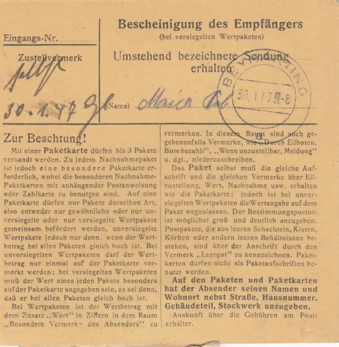 BiZone Paketkarte 1947: Augenoptik Fürth nach Beyharting Bad Aibling