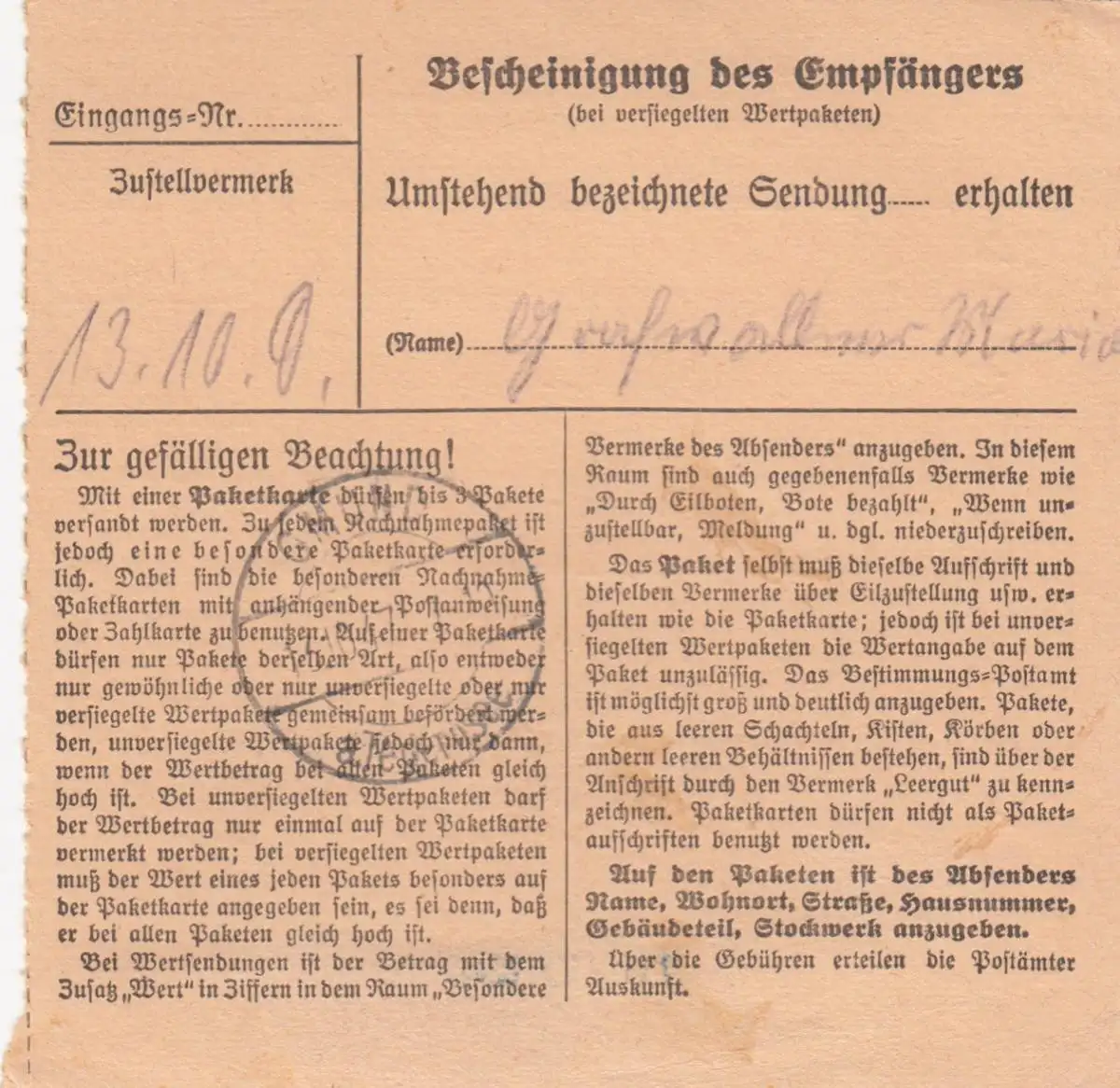 BiZone Paketkarte 1947: Stuttgart nach Zollersberg Tegernsee