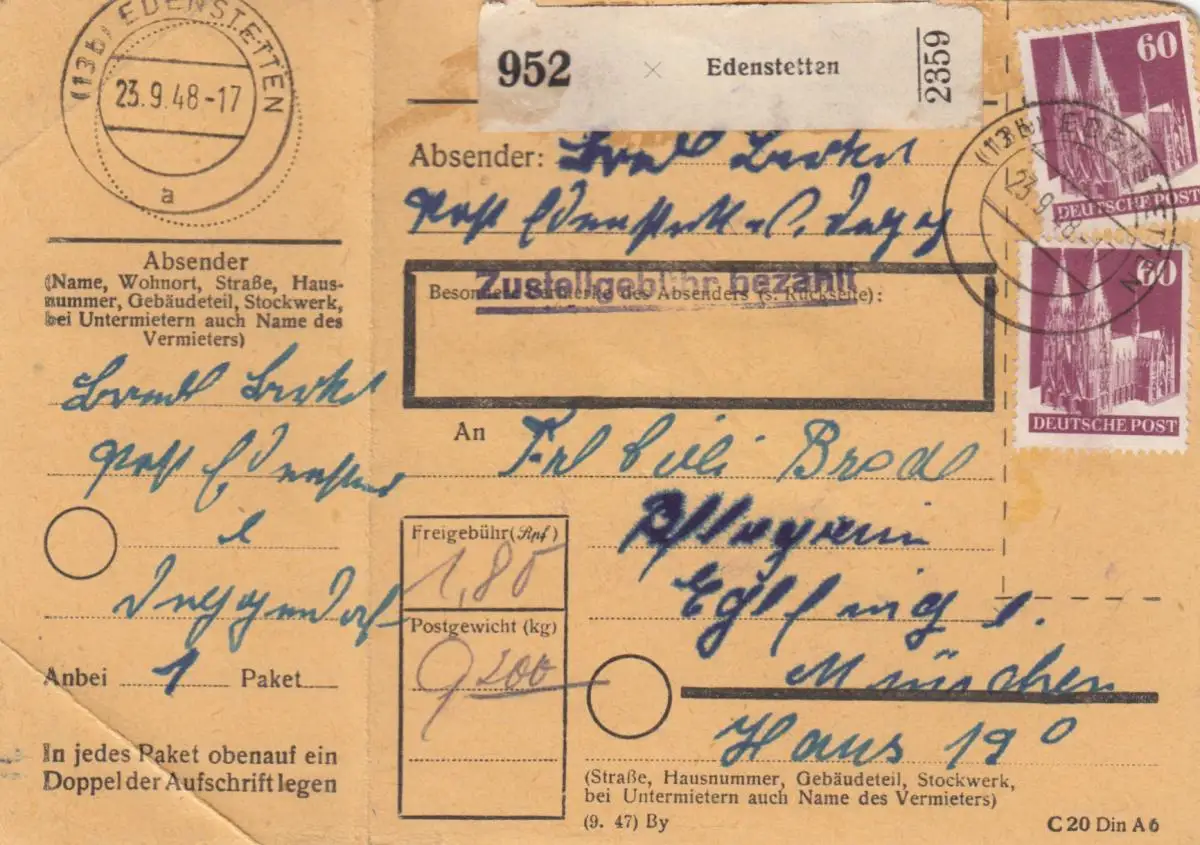BiZone Paketkarte 1948: Edenstetten nach Eglfing, Pflegerin