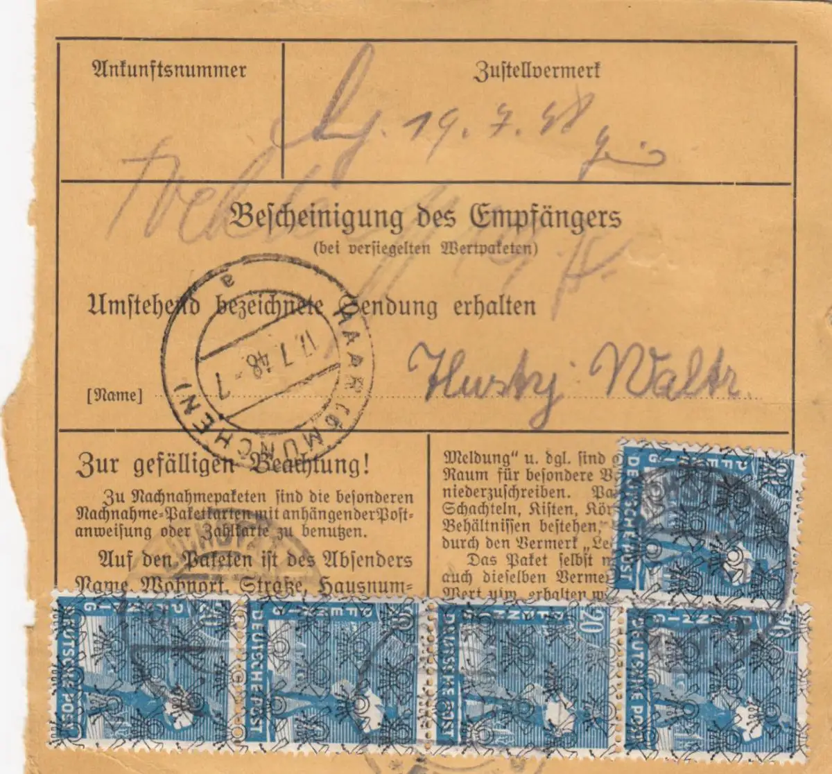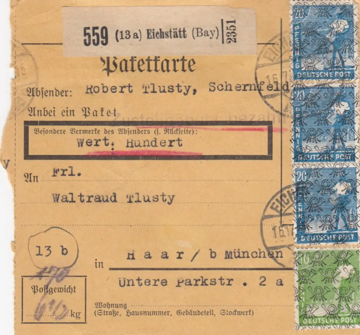 BiZone Paketkarte 1948: Eichstätt nach Haar, Wertkarte
