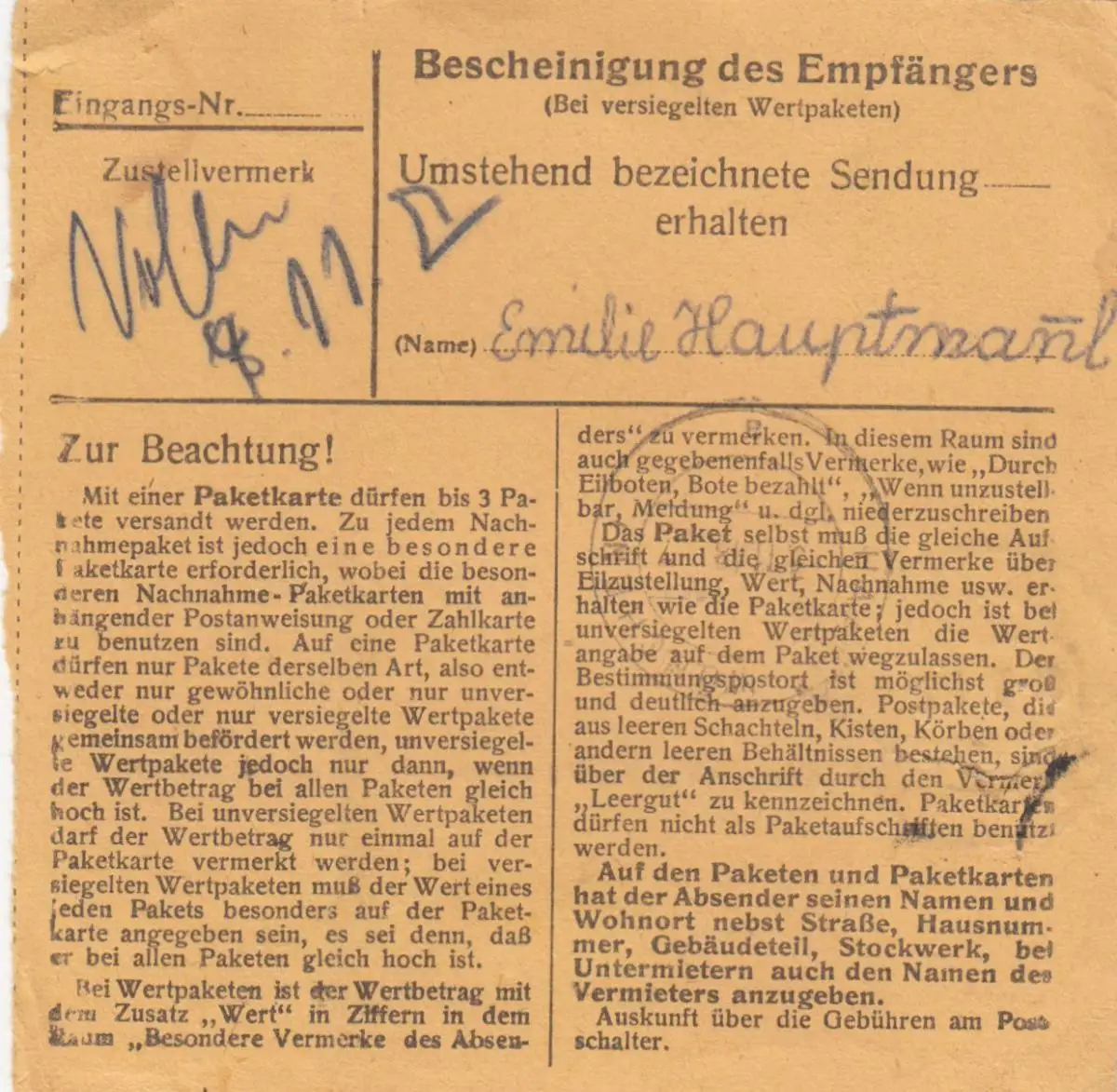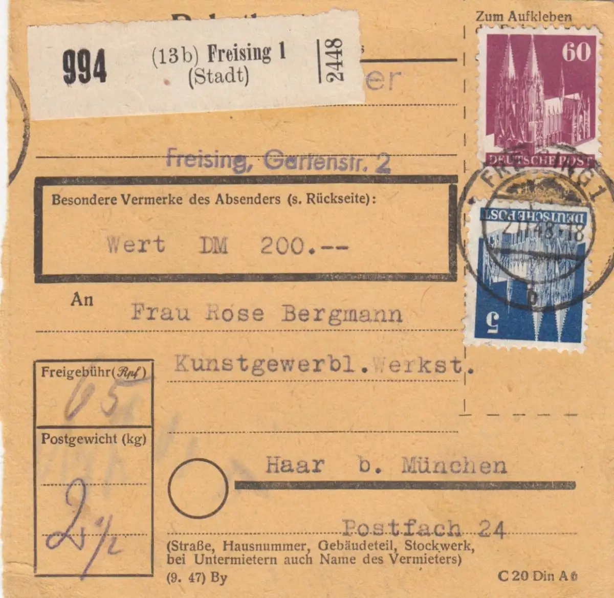 BiZone Paketkarte 1948: Freising nach Haar, Wert 200 DM