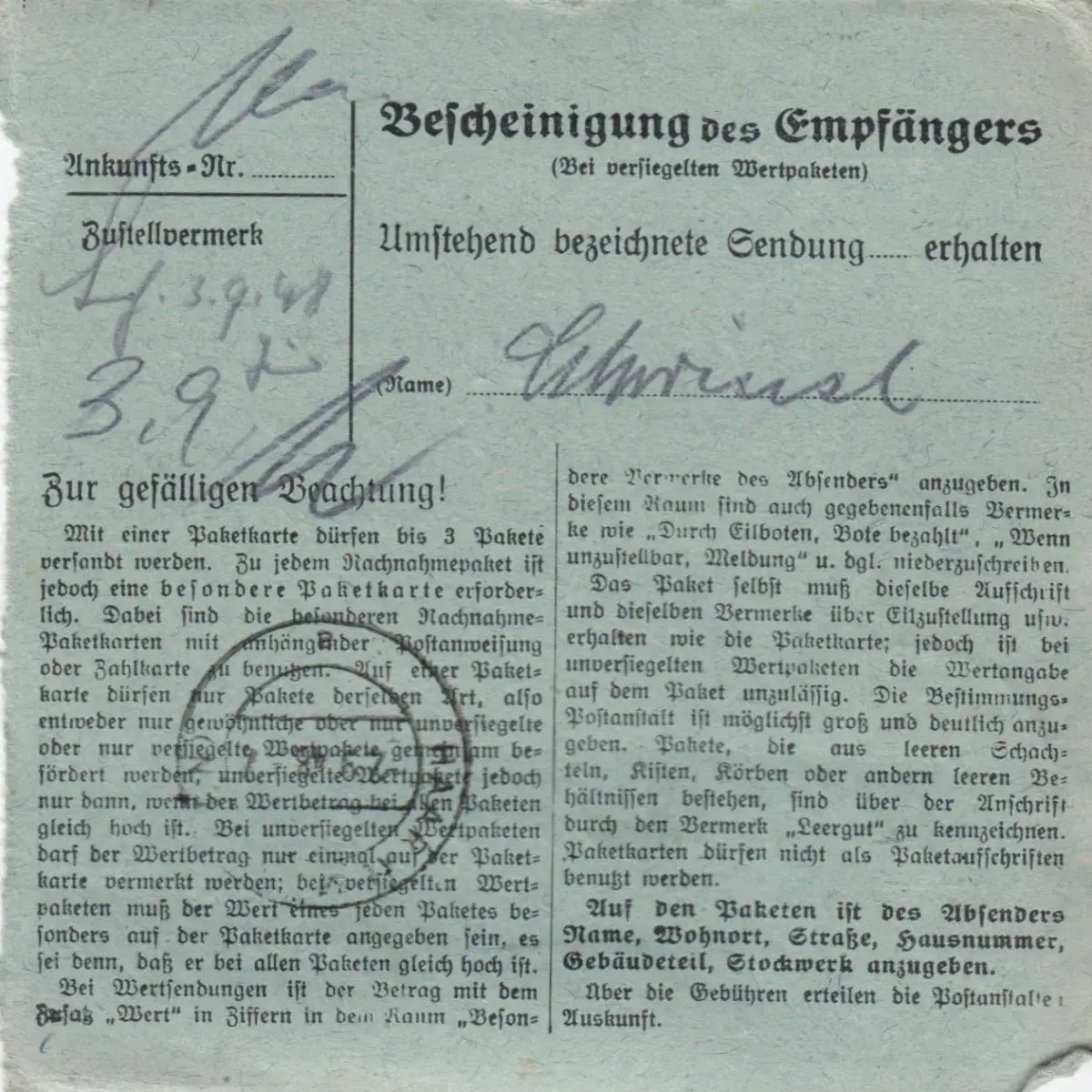 BiZone Paketkarte 1948: Hauzenberg nach Haar, besonderes Formular