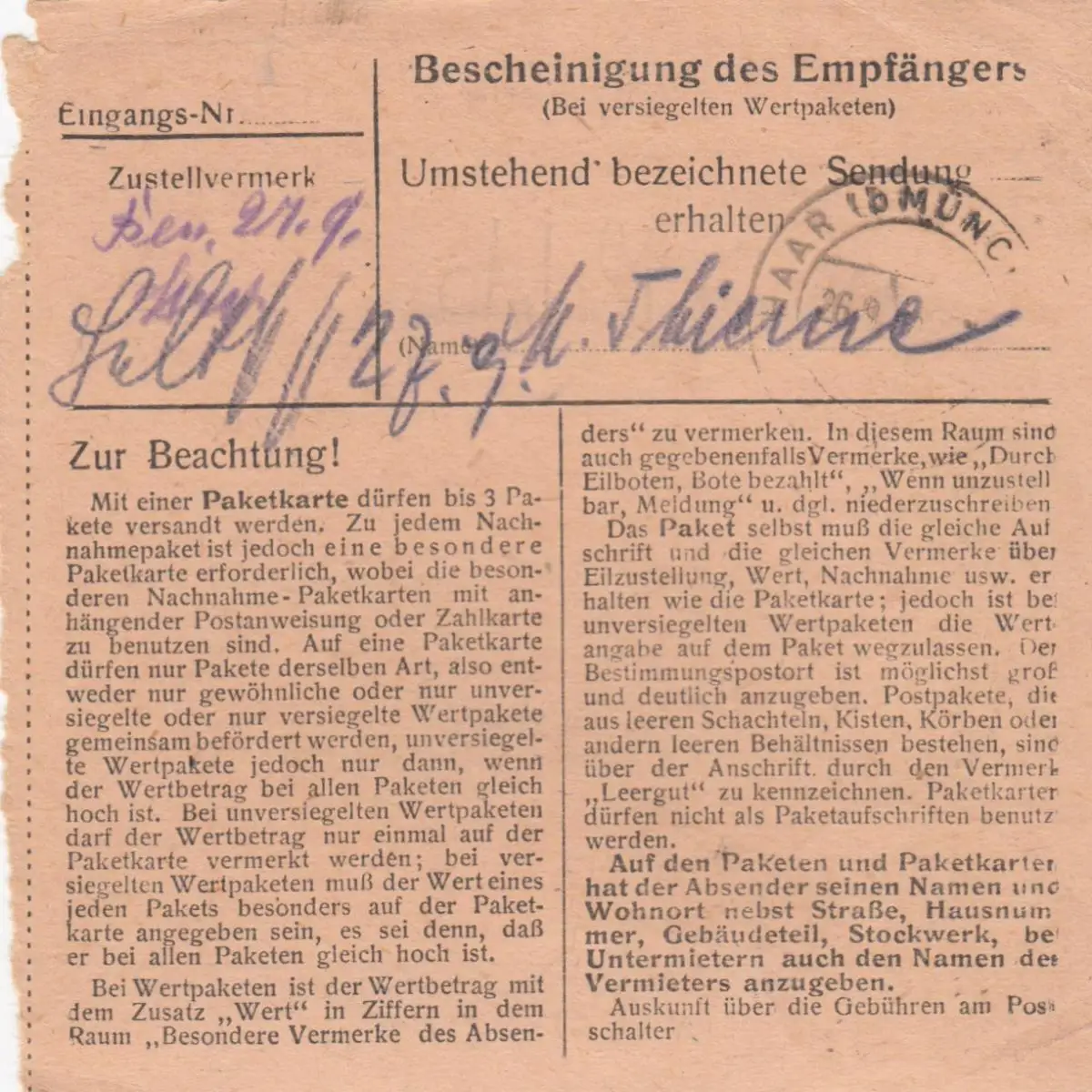BiZone Paketkarte 1948: Hawangen über Memmingen nach Haar