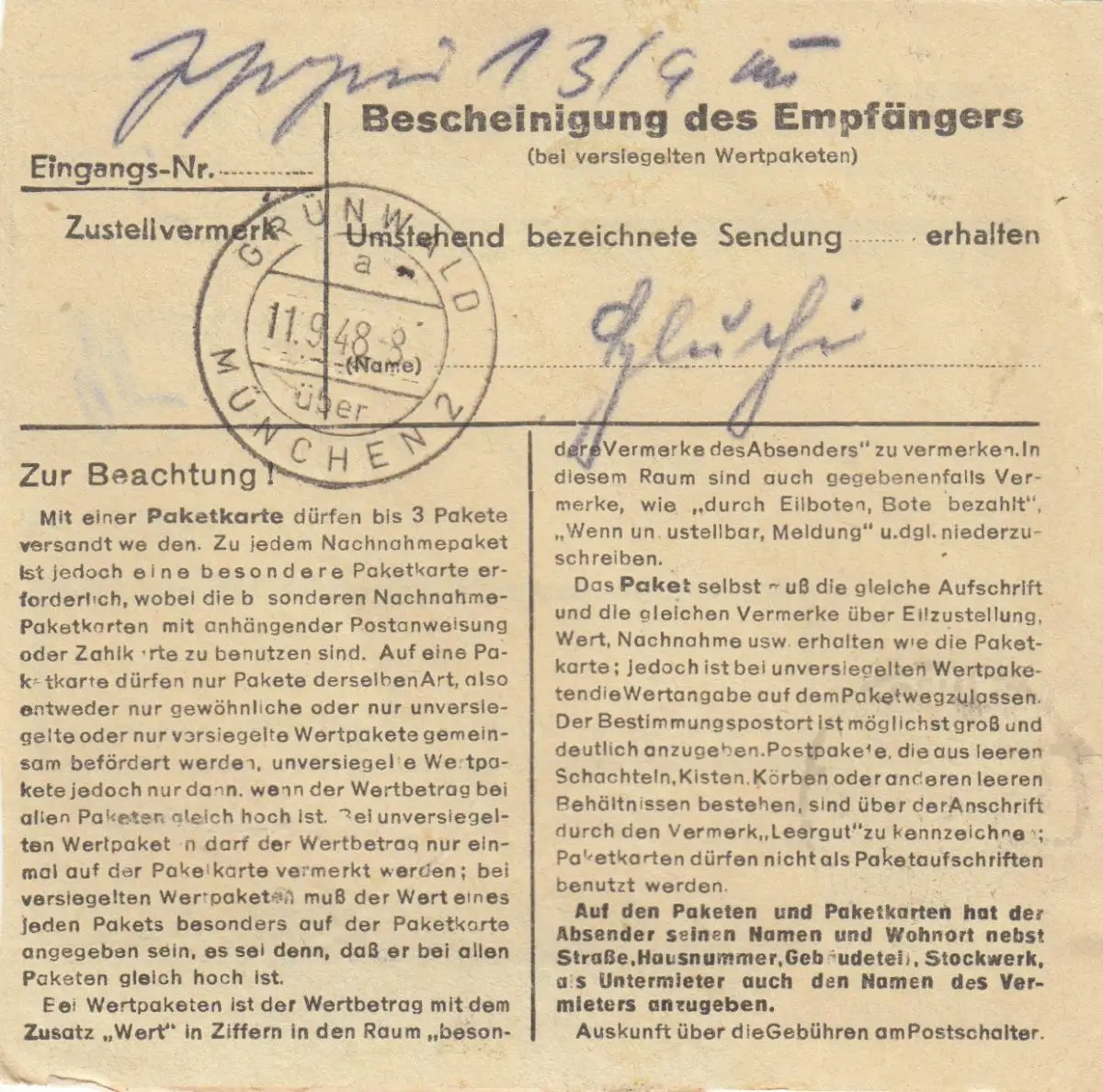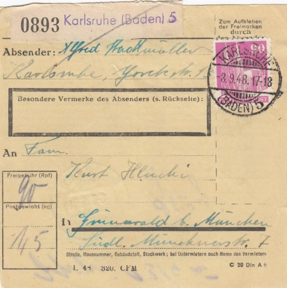 BiZone Paketkarte 1948: Karlsruhe nach Grünwald