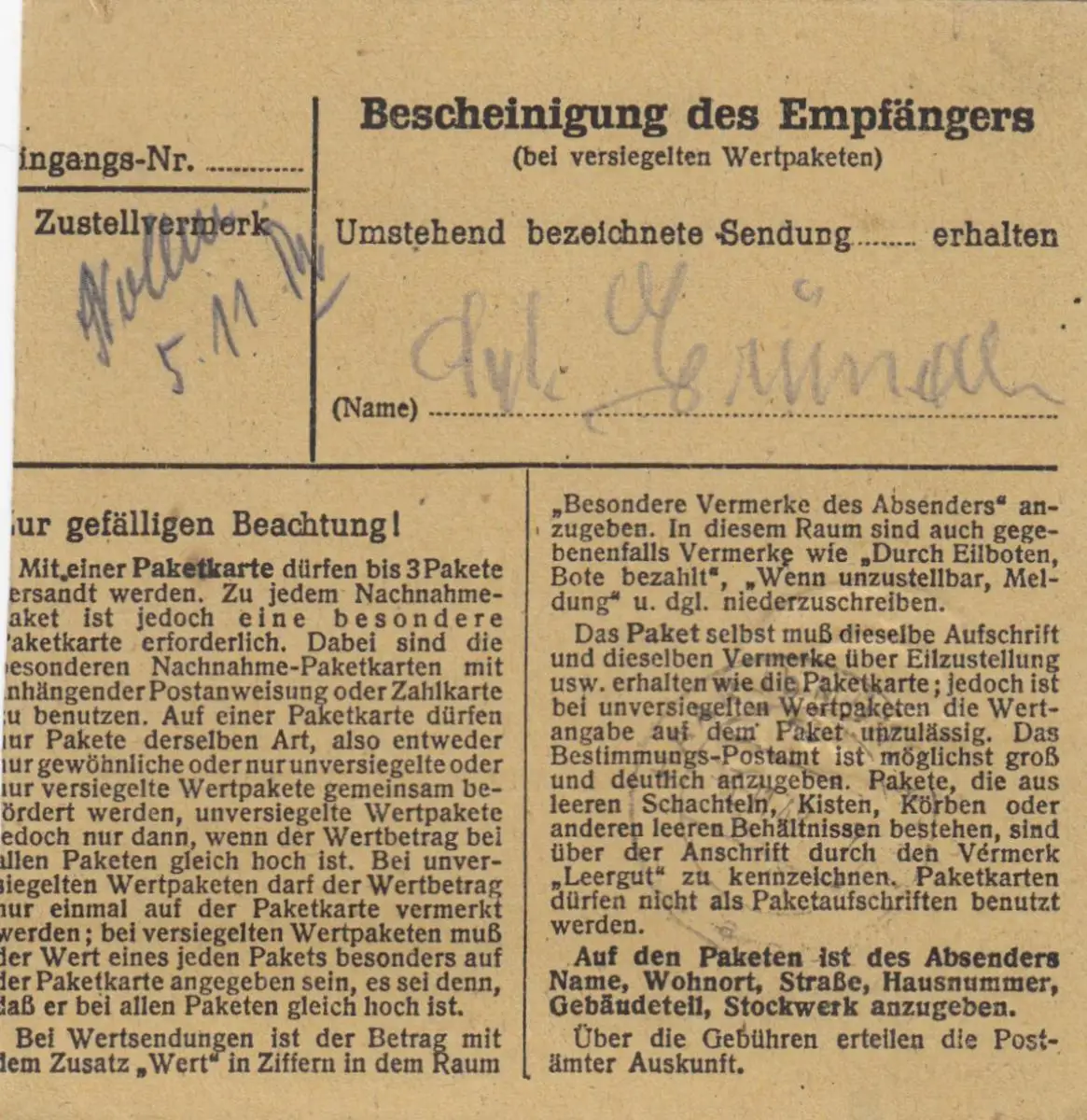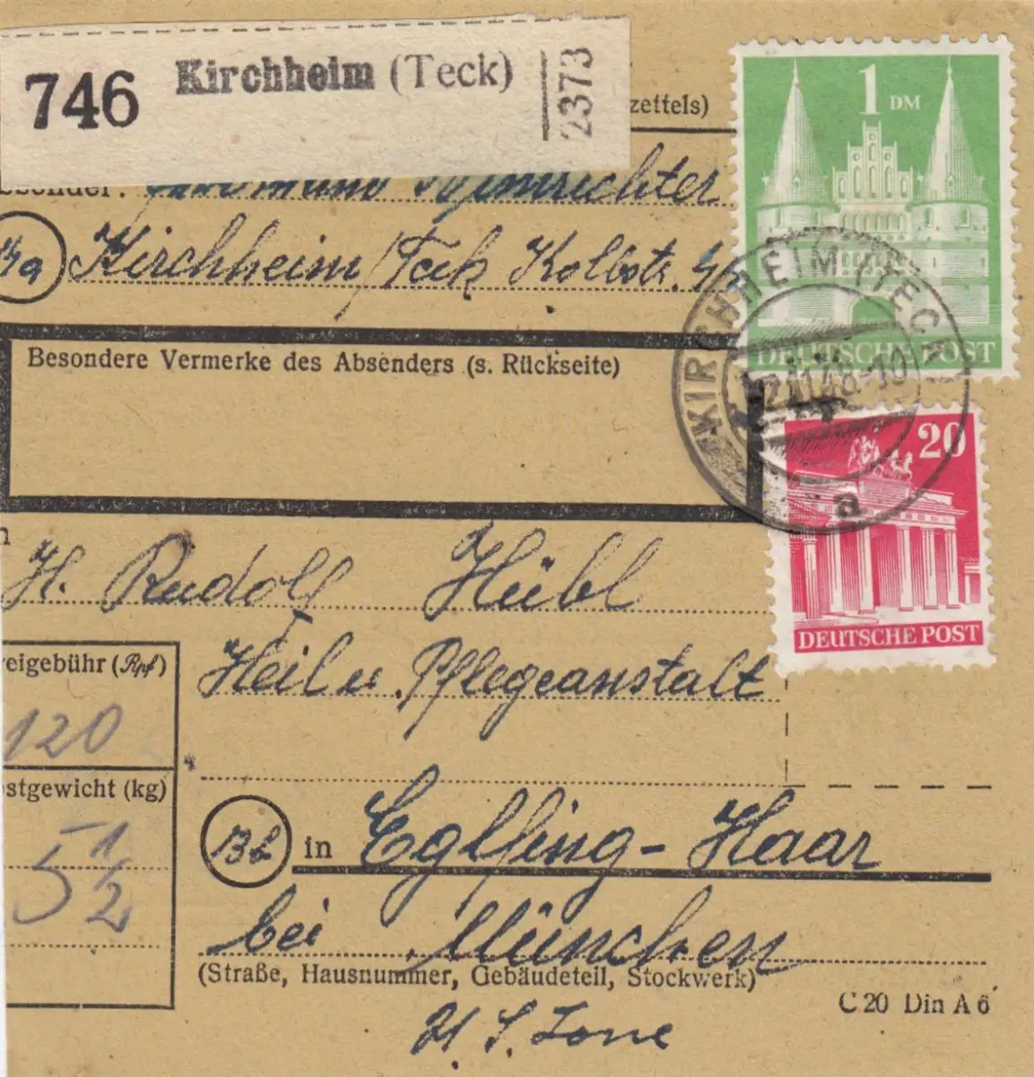 BiZone Paketkarte 1948: Kirchheim Teck nach Eglfing-Haar, Heilanstalt