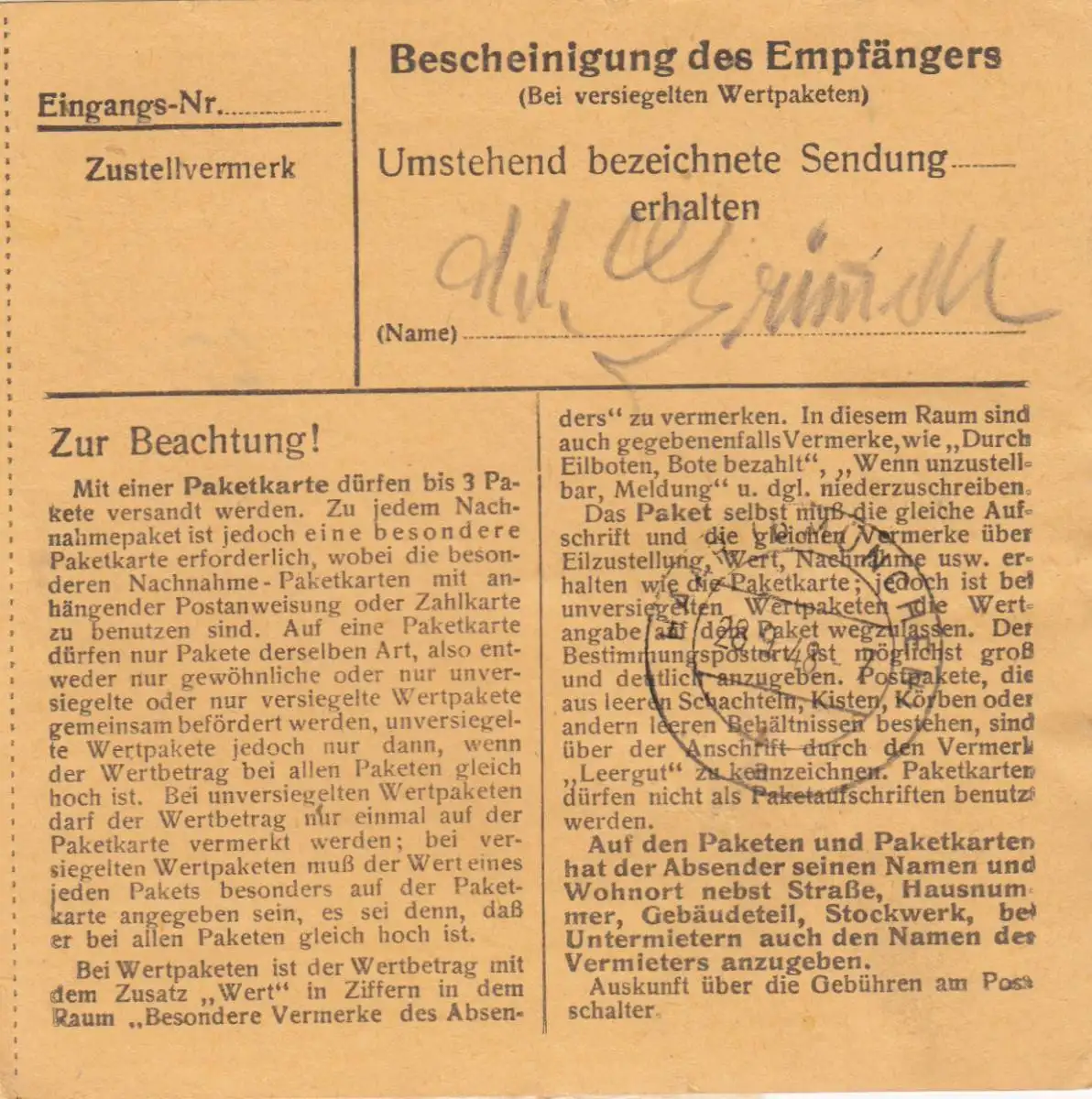 BiZone Paketkarte 1948: Oberammergau nach Eglfing-Haar, Pflegerin