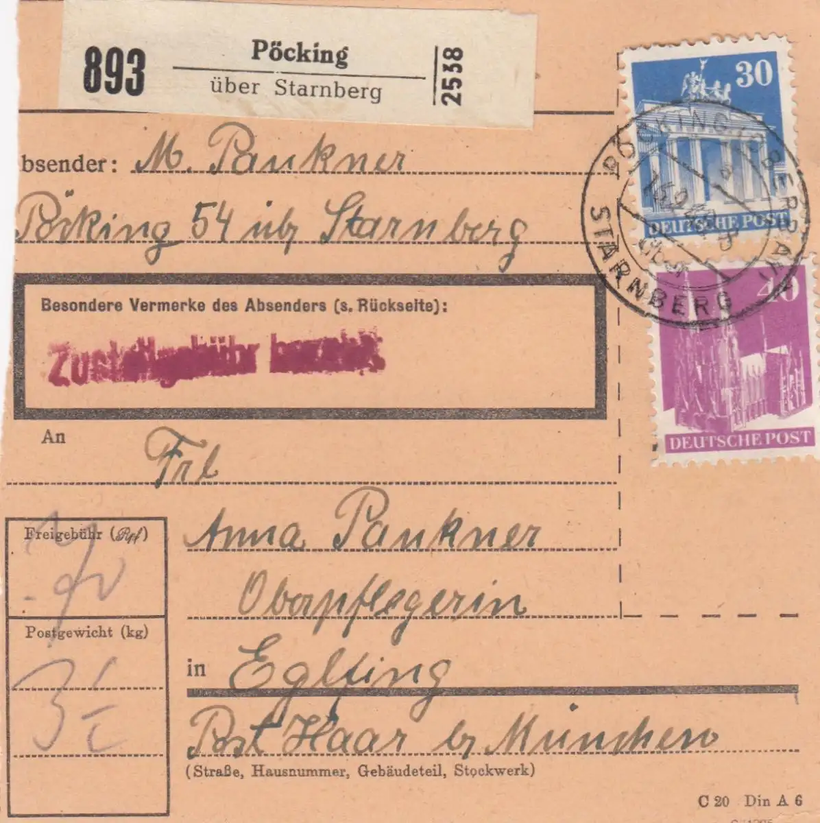 BiZone Paketkarte 1948: Pöcking nach Starnberg, Oberpflegerin