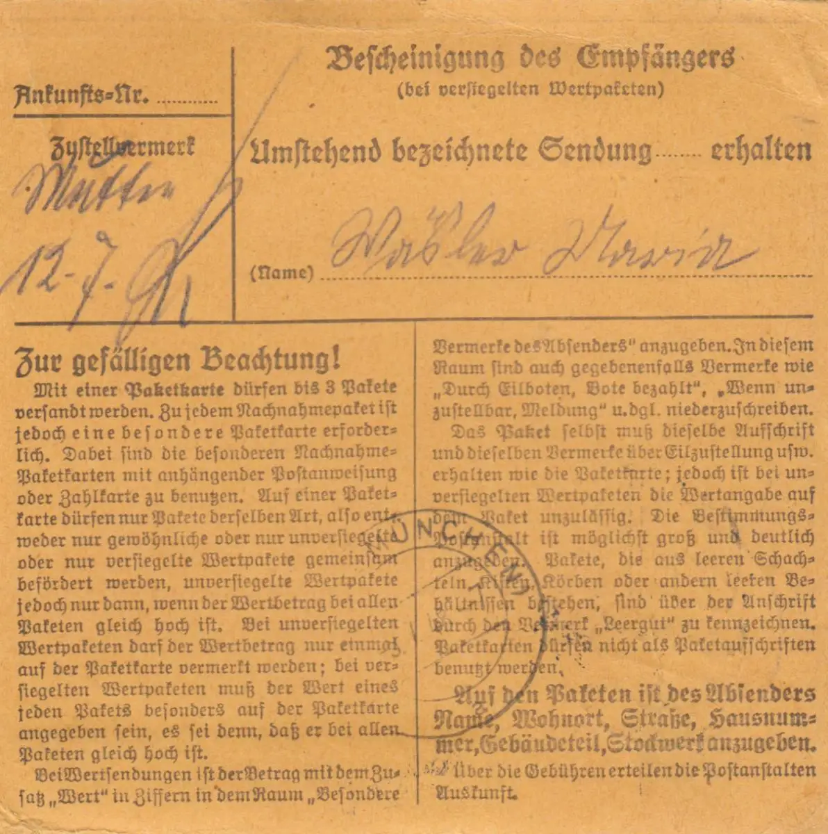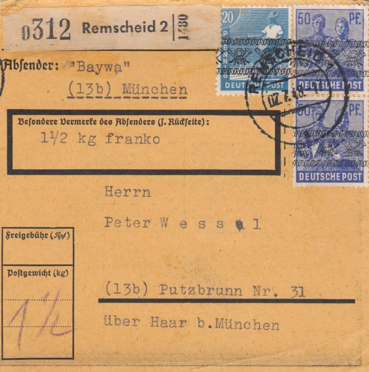 BiZone Paketkarte 1948: Remscheid nach Putzbrunn, 1 1/2 kg franko