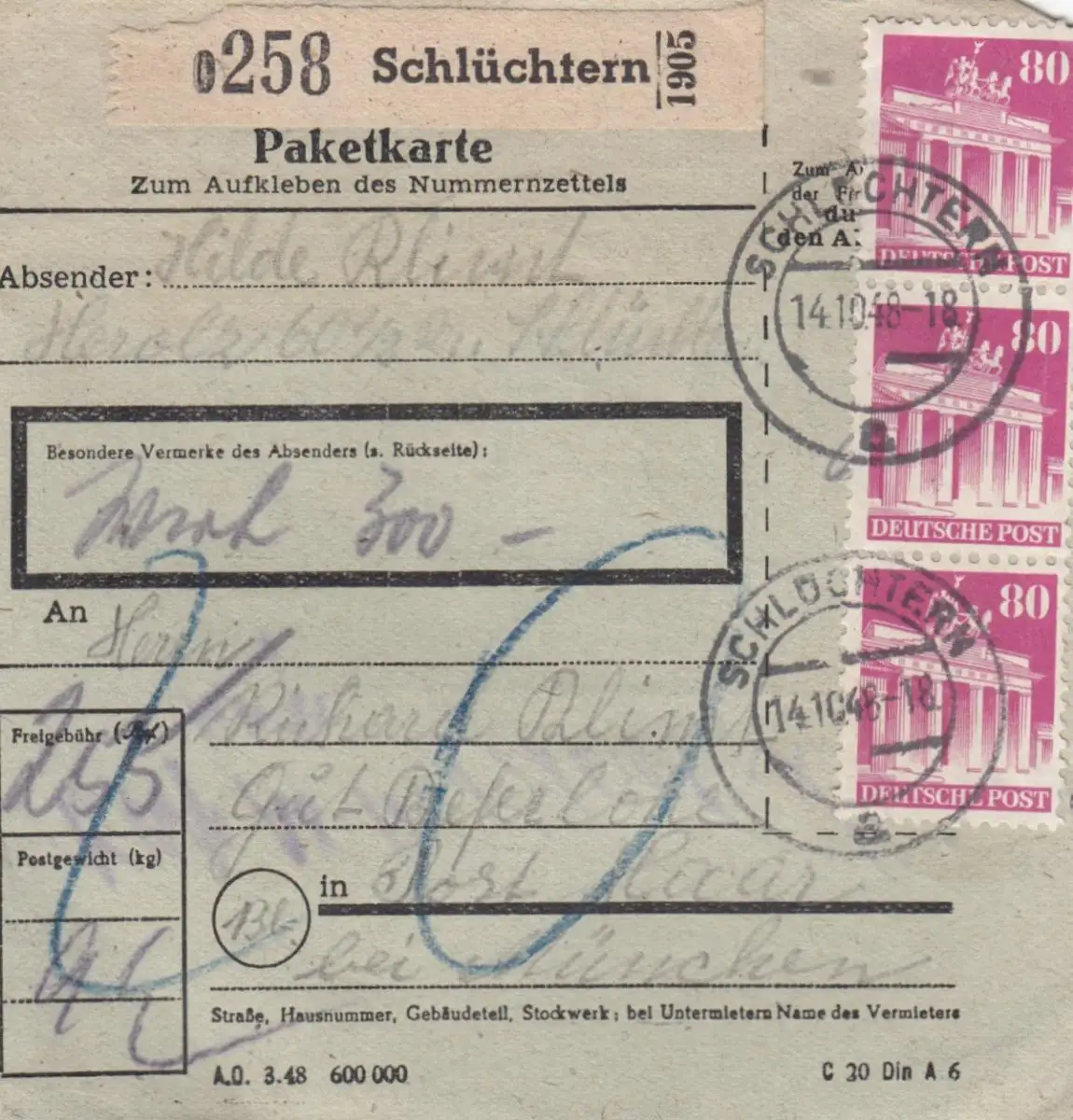 BiZone Paketkarte 1948: Schlüchtern nach Post Haar, Wertkarte, seltenes Formular