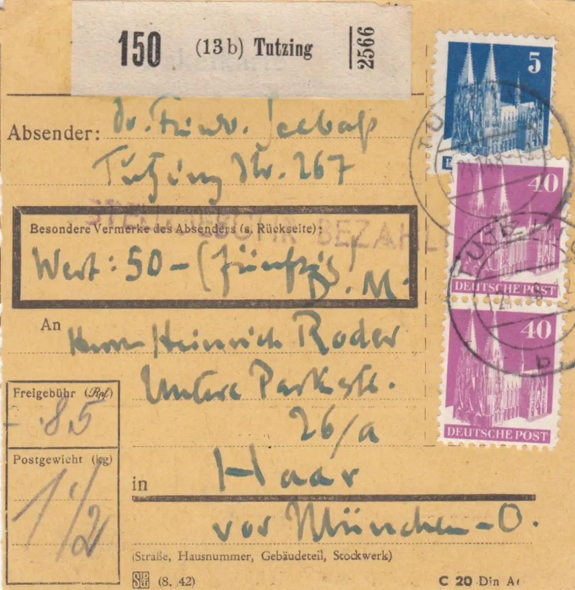 BiZone Paketkarte 1948: Tutzing nach Haar, Wertkarte