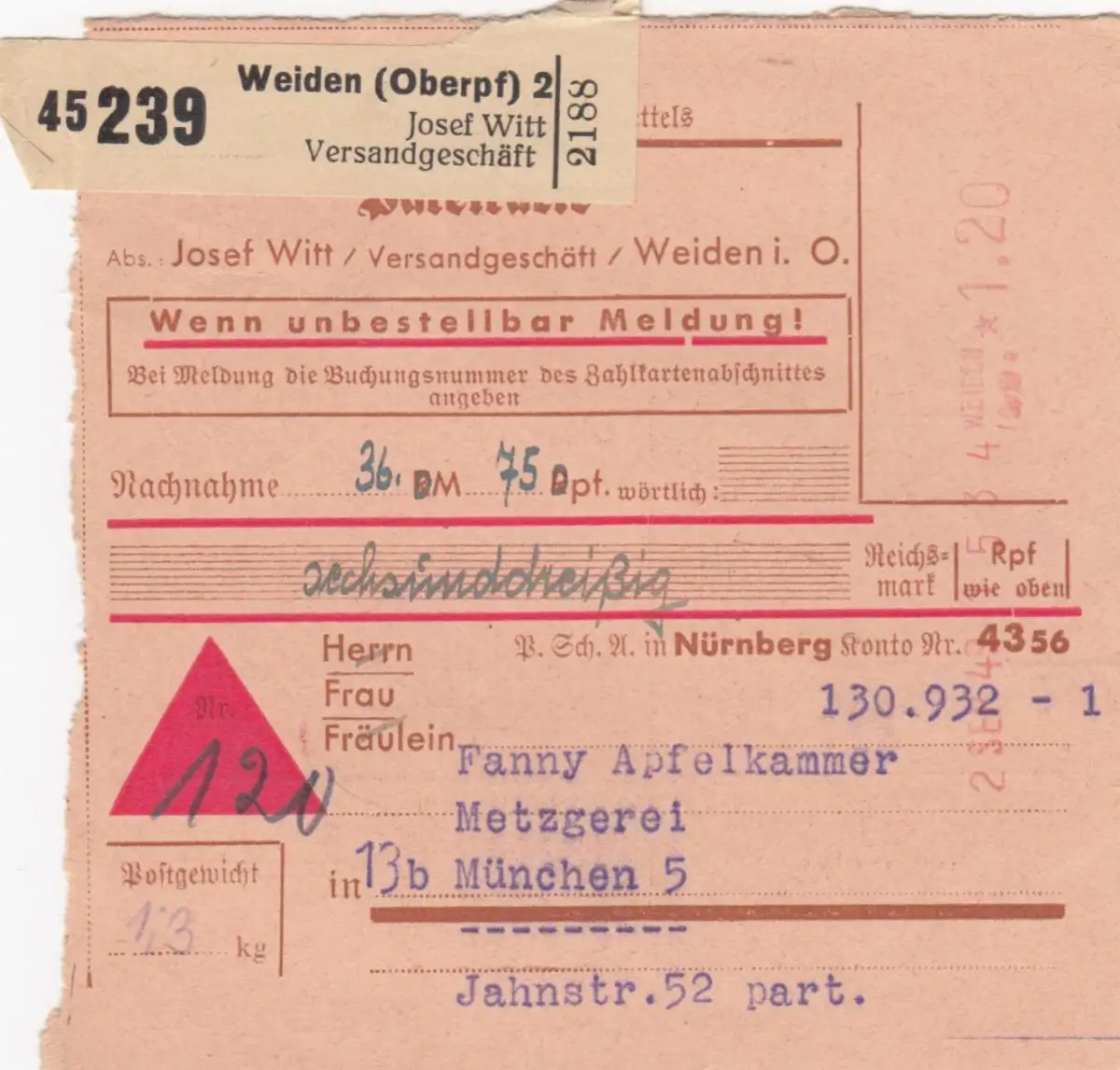 BiZone Paketkarte 1948: Weiden, Witt nach München, Selbstbucher, Nachnahme