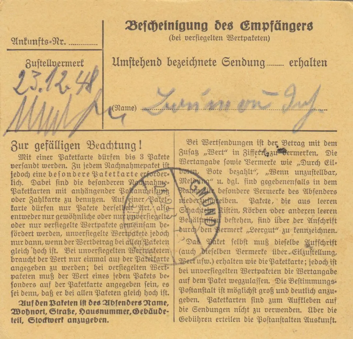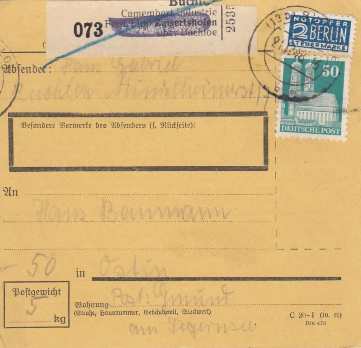 BiZone Paketkarte 1948: Zaisertshofen nach Ostin, Notopfer, Selbstbucher