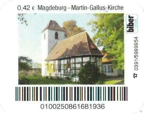 • MichSeite Biberpost: 12.11.2008, "Martin-Gallus-Kirche, Magdeburg", Satz, Typ VI, postfrisch Beschreibung \nAusgabeland: Bundesrepublik Deutschland \nPostdienstleister: Biberpost, Magdeburg \nAusgabeanlass: personalisierte Briefmarkenausgabe "Martin-Gallus-Kirche, Magdeburg" Katalognummer: - Ausgabedatum: 12.11.2008 Nominale: Satz (1 Wert) zu 0,42 EUR \nTyp: VI (altes Logo) \nErhaltung: selbstklebend, gerade gestanzt, postfrisch \nHinweis: -