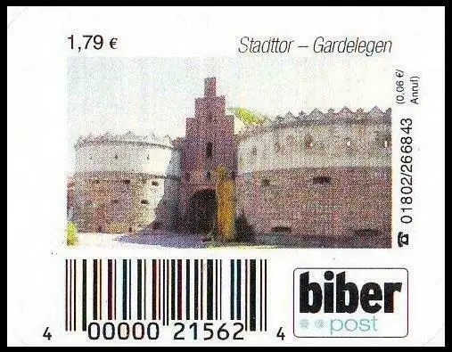 • MichSeite Biberpost: MiNr. 23, 02.01.2007, "Sehenswürdigkeiten (II): Gardelegen, Stadttor", Wert zu 1,79 EUR, Typ I, postfrisch Beschreibung \nAusgabeland: Bundesrepublik Deutschland \nPostdienstleister: Biberpost, Magdeburg \nAusgabeanlass: Briefmarkenausgabe "Sehenswürdigkeiten (II): Gardelegen, Stadttor" Katalognummer: MiNr. 23 Ausgabedatum: 02.01.2007 Nominale: Wert zu 1,79 EUR \nTyp: I \nErhaltung: selbstklebend, zähnungsartig gestanzt, postfrisch \nHinweis: -