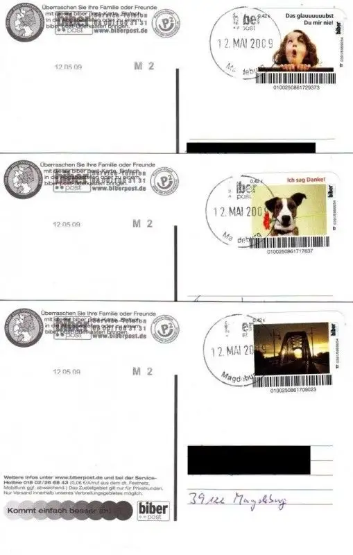 • MichSeite Biberpost: MiNr. 69 - 71, 11.05.2009, "Werbegeschenk an Kunden", Satz (3 Belege), Typ VI, Versand innerhalb Magdeburgs, entwertet mit Freistempelung Beschreibung \nAusgabeland: Bundesrepublik Deutschland \nPostdienstleister: Biberpost, Magdeburg \nAusgabeanlass: Briefmarkenausgabe "Werbegeschenk an Kunden" Katalognummer: MiNr. 69 - 71 Ausgabedatum: 11.05.2009 Nominale: Satz (3 Werte) zu je 0,42 EUR \nTyp: VI \nErhaltung: selbstklebend, zähnungsartig gestanzt, echt gelaufen in diesem Zeitraum in Magdeburg, entwertet mit Freistempelung vor dem 23.05.2009 (Gratiszeitraum) \nHinweis: an Kunden verschenkt, jeder Briefmarke ist auf einer Postkarte mit bildgleichem Motiv verklebt, bis 23.05.2009 echt gelaufene Belege stammen aus Kundengeschenken