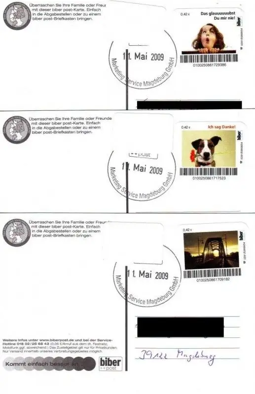 • MichSeite Biberpost: MiNr. 69 - 71, 11.05.2009, "Werbegeschenk an Kunden", Satz (3 Belege), Typ VI, Versand innerhalb Magdeburgs, entwertet mit Handstempel, zusätzlich mit Label "M_2" und Datum Beschreibung \nAusgabeland: Bundesrepublik Deutschland \nPostdienstleister: Biberpost, Magdeburg \nAusgabeanlass: Briefmarkenausgabe "Werbegeschenk an Kunden" Katalognummer: MiNr. 69 - 71 Ausgabedatum: 11.05.2009 Nominale: Satz (3 Werte) zu je 0,42 EUR \nTyp: VI \nErhaltung: selbstklebend, zähnungsartig gestanzt, echt gelaufen in diesem Zeitraum in Magdeburg, entwertet mit Handstempel, zusätzlich mit Label "M_2" und Datum vor dem 23.05.2009 (Gratiszeitraum) \nHinweis: an Kunden verschenkt, jeder Briefmarke ist auf einer Postkarte mit bildgleichem Motiv verklebt, bis 23.05.2009 echt gelaufene Belege stammen aus Kundengeschenken