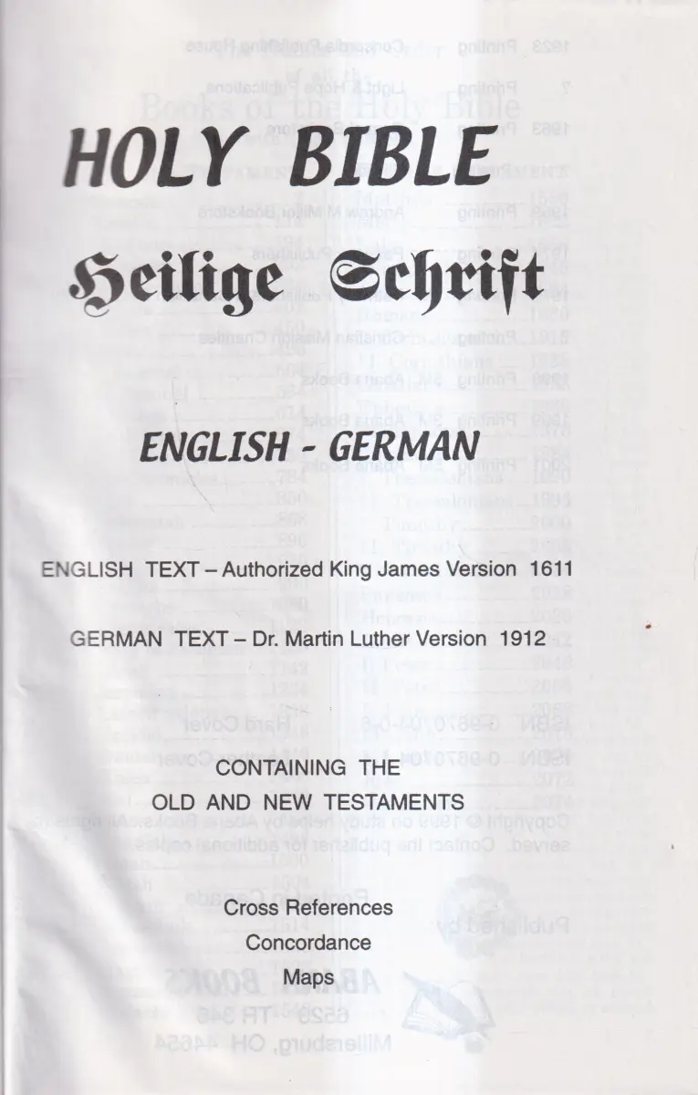 Bemerkungen: Zustand: Einband minimal berieben. // Zweisprachig, Text in Englisch und Deutsch. English Text authorized King James version 1611, German Text Dr. Martin Luther Version 1912.