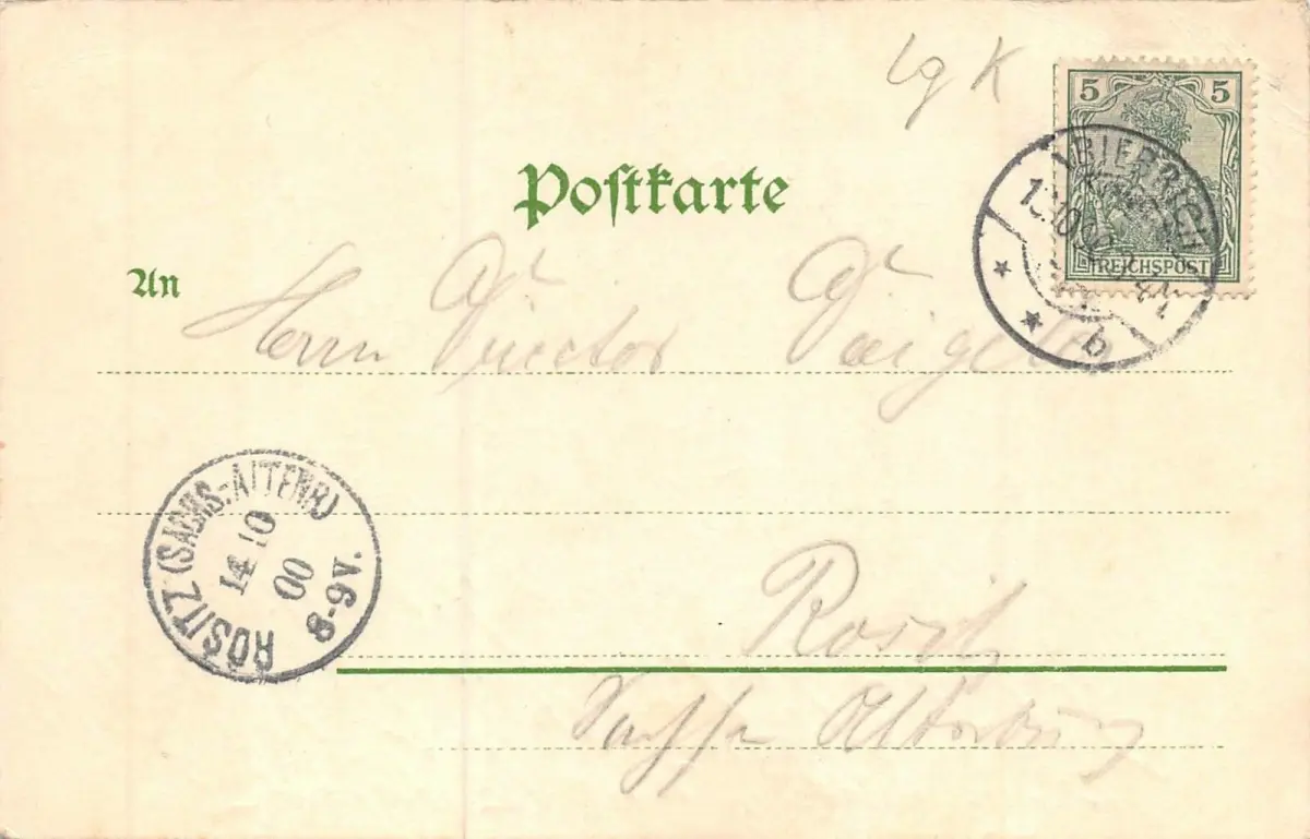 Rückseite: gelaufen 1900 von Biebrich nach Rositz