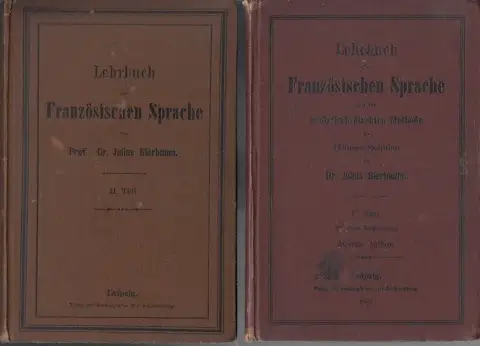 die Sieten sind gebräunt und fleckig, die Einbände sind fleckig und an den Kanten bestoßen, Namenseinträge, die Einbände sind von innen teils beschrieben, aus dem Inhalt: Teil 1: Vorschule - Leseübungen - Lese-, Sprech- und Grammatikübungen - Formenlehre - Uebungsstücke - Vocabulaire - Anhang, Lieder. Teil 2: Conjugaisons Vivantes ou regulieres - Verbes en - er - Verbes en -ir - Formenlehre - Vocabulaire - Wiederholung: aus dem I. Teile . Appendice (Lieder) Beschreibung vom Antiquariat Ardelt 4h3a Antiquariat Ardelt