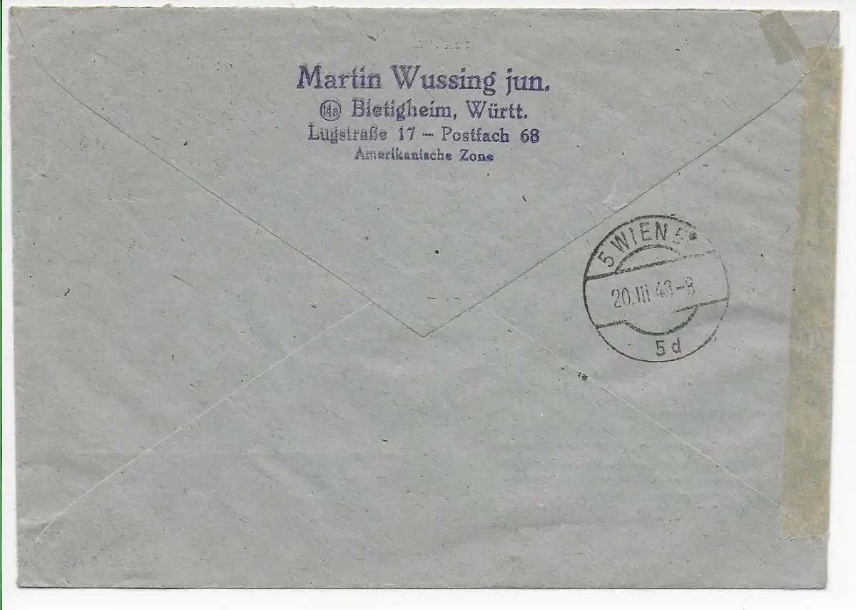 Bietigheim Einschreiben 1947 nach Wien, Zensur: Stempel Falscheinstellung: 1937