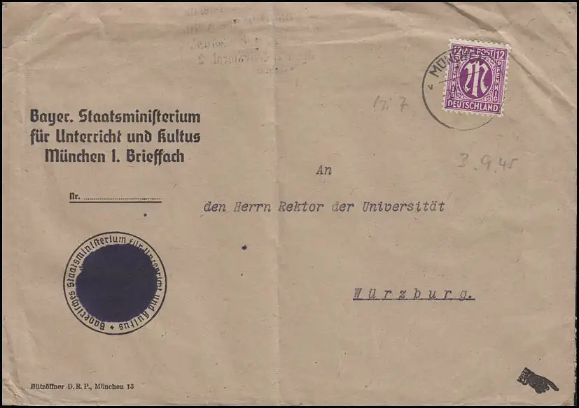 Bizone 7 AM-Post 12 Pf. EF Bf Ministerium Unterricht und Kultus MÜNCHEN 3.11.45