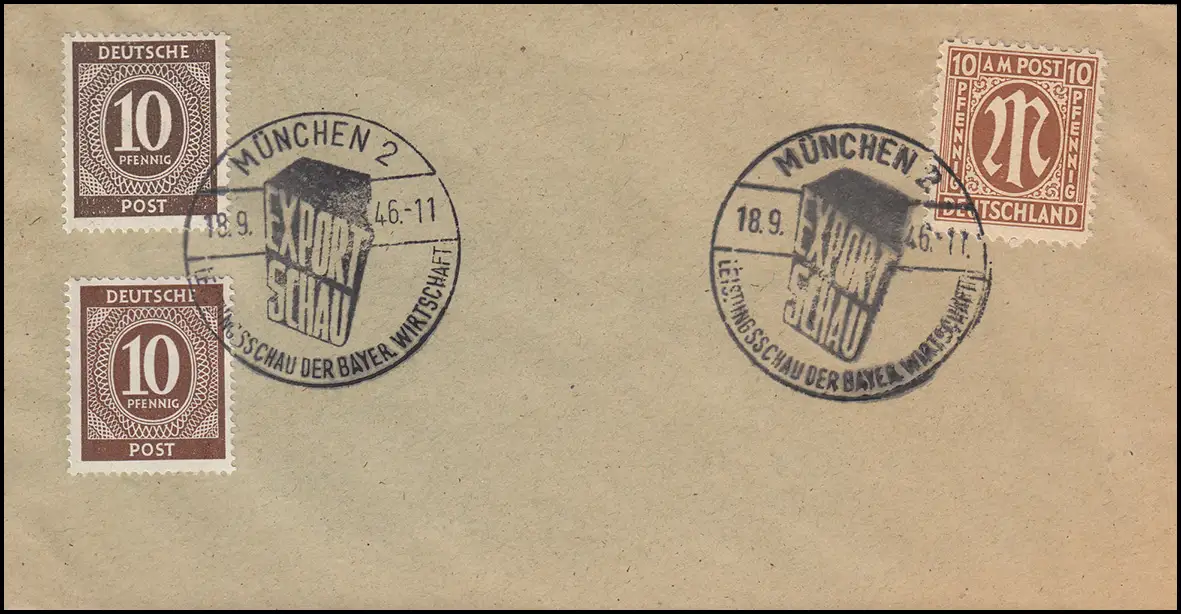 Umschlag mit zwei Farbvarianten der 10 Pfennig Ziffernmarke braun, mit Sonderstempel MÜNCHEN 2 EXPORT SCHAU LEISTUNGSSCHAU DER BAYER. WIRTSCHAFT 18.9.46