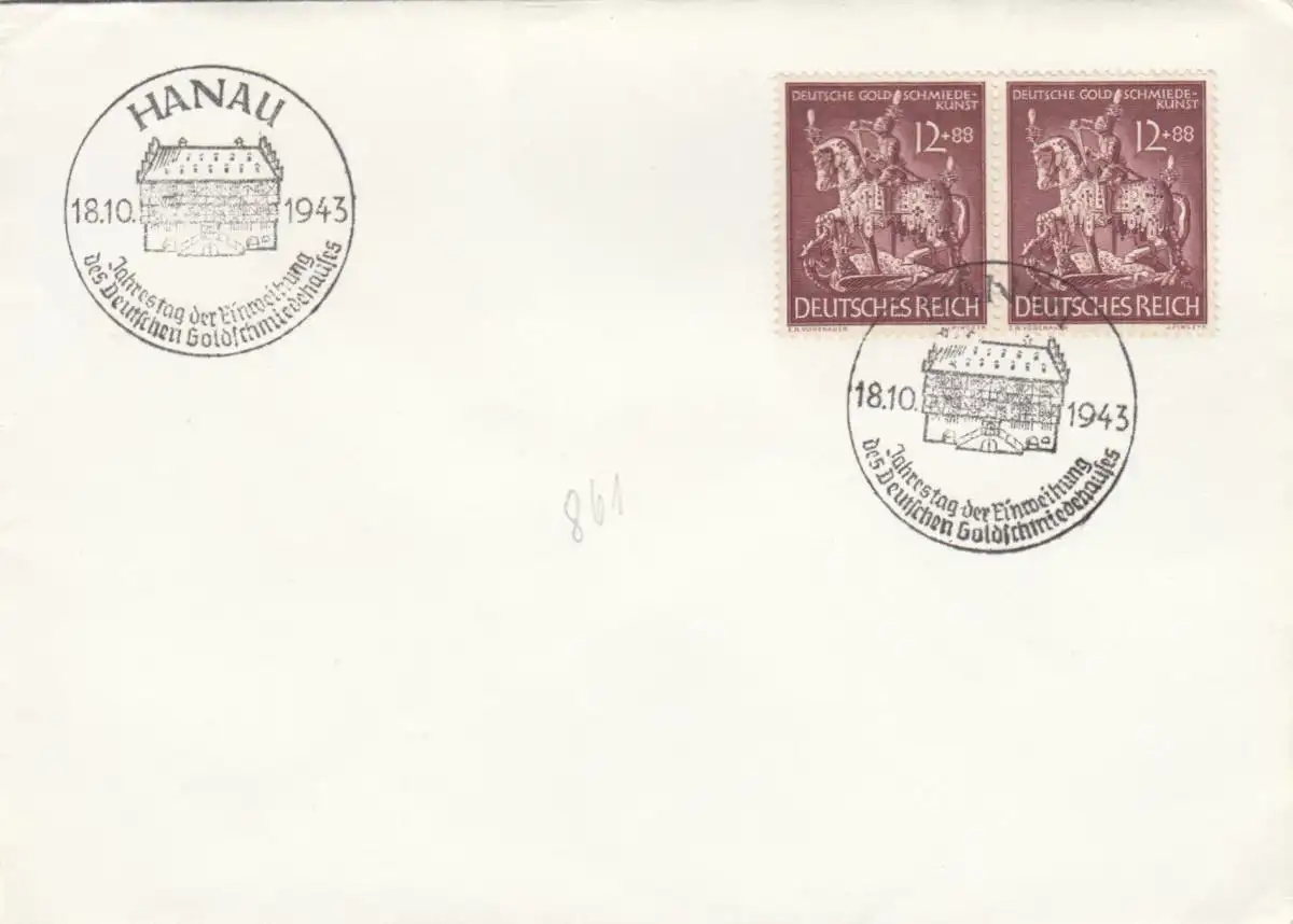 Blanko Sonderstempelbeleg 1943: Hanau: Jahrest. Einweihg. Deut. Goldschmiedehaus