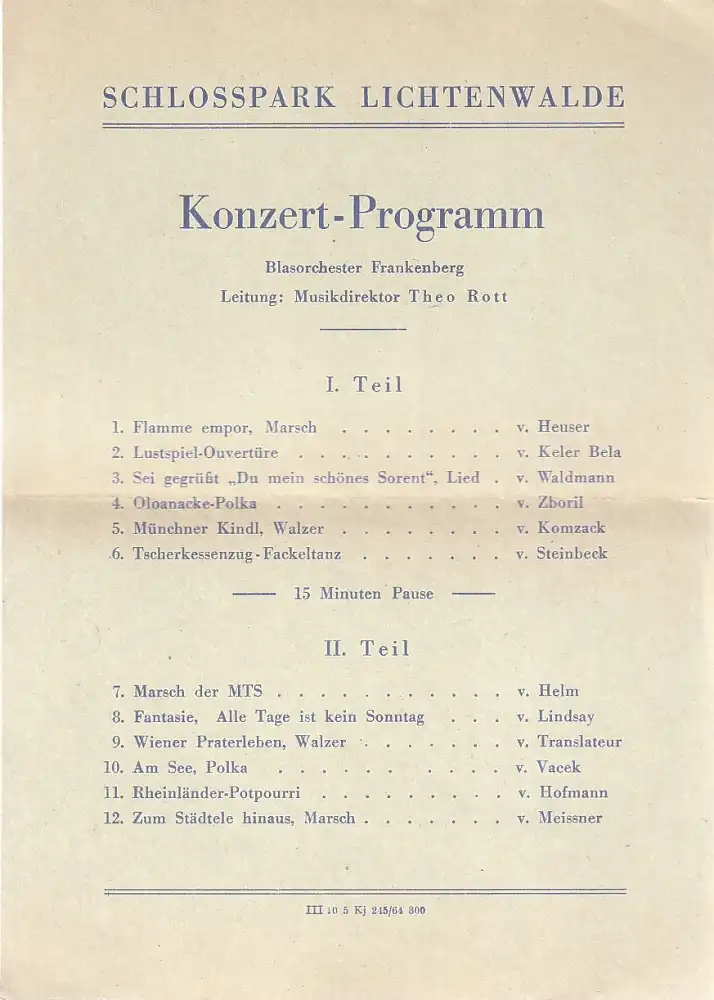 Titel: Theaterzettel KONZERT-PROGRAMM BLASORCHESTER FRANKENBERG Schlosspark Lichtenwalde 1964