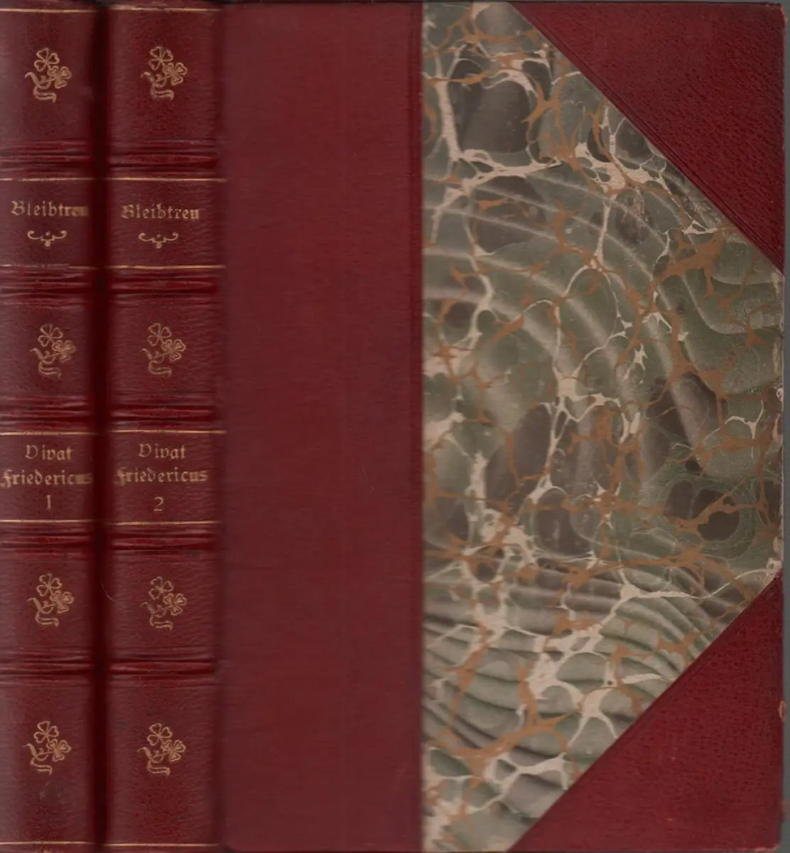 Erste Ausgabe des Werkes, in dem wichtige Schlachten aus dem Siebenjährigen Krieg (genauer: der Jahre 1756 bis 1760) beschrieben werden. Im Gegensatz zu Bleibtreus blumiger Sprache in den "Schlachtdichtungen" steht der unaufgeregte Stil der teils umfangreichen Anmerkungen, die das Kriegsgeschehen sachlich und unter Angabe vieler Zahlen erläutern. "Vivat Friedericus!" erschien innerhalb einer größeren Anzahl von Schlachtenschilderungen, die Carl Bleibtreu zwischen 1882 und 1912 verfaßte (s. NDB 2 (1955), S. 298 [Onlinefassung]). Bd. 1. Von Lowositz bis Leuthen. Bd. 2. Von Zorndorf bis Torgau. - Gutes, sauberes Exemplar