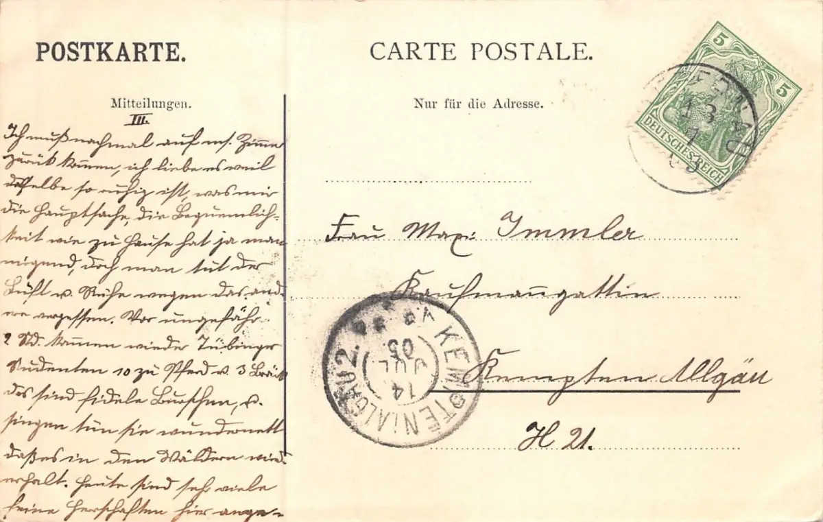 Rückseite: gelaufen 1905 von Niedernau nach Kempten (Allgäu)