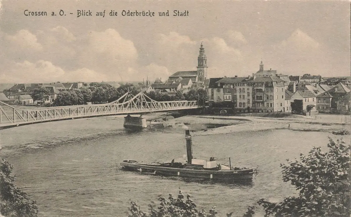 Blick auf Oderbrücke und Stadt Crossen an der Oder Ostbrandenburg Postkarte AK