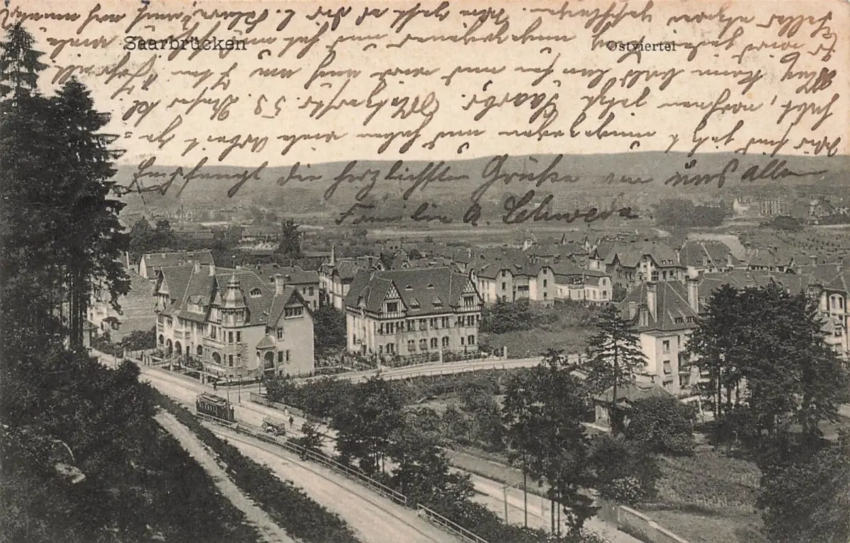 Blick auf Saarbrücken Straßenansicht und Straßenbahn Saarland Postkarte AK 1913