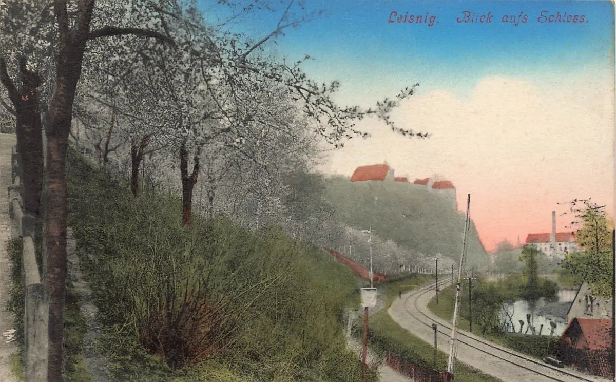 Blick aufs Schloss an den Gleisen Leisnig Sachsen Postkarte AK 1916