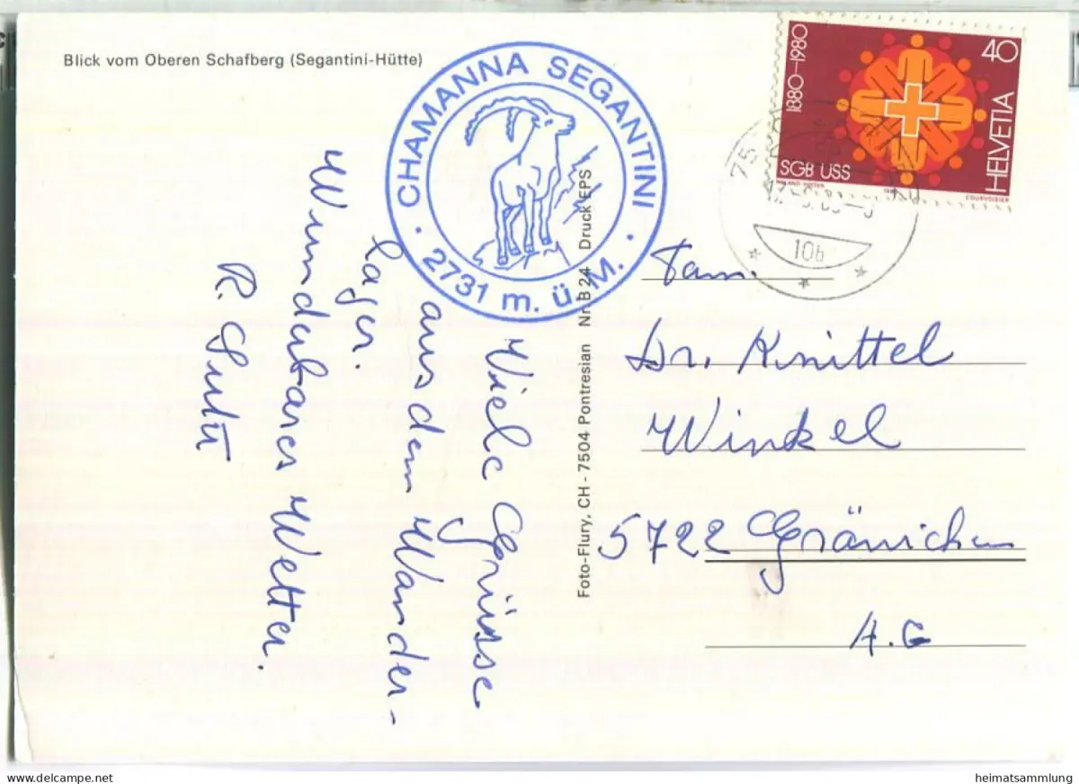 Blick vom Oberen Schafberg - Segantini-Hütte - Verlag Foto-Flury Pontresina - leichte Gebrauchsspuren (E88463) gel. 1980