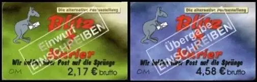 • MichSeite Blitz-Kurier: "Einschreibemarken (IV)", Satz, postfrisch Beschreibung \nAusgabeland: Bundesrepublik Deutschland \nPostdienstleister: Blitz-Kurier, Rathenow \nAusgabeanlass: Briefmarkenausgabe "Einschreibemarken (IV)" Katalognummer: MiNr. Ausgabedatum: Nominale: Satz (2 Werte) zu 2,17 EUR, 4,58 EUR \nTyp: - \nErhaltung: selbstklebend, gerade gestanzt, postfrisch \nHinweis: -