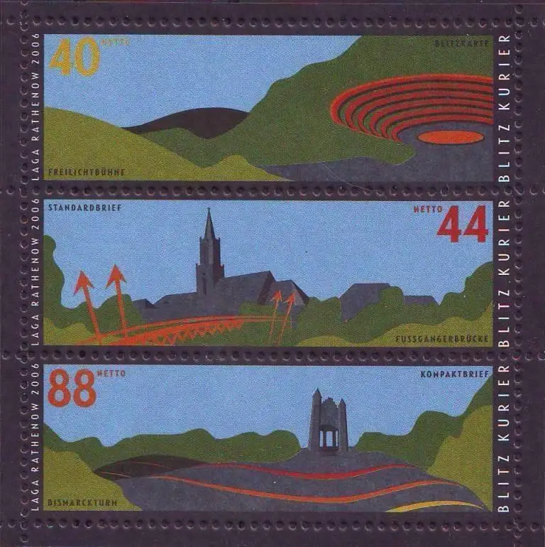 • MichSeite Blitz-Kurier: MiNr. 1 - 3 KB 2, 01.03.2004, "Landesgartenschau Rathenow 2006", Zusammendruckbogen, postfrisch Beschreibung \nAusgabeland: Bundesrepublik Deutschland \nPostdienstleister: Blitz-Kurier, Rathenow \nAusgabeanlass: Briefmarkenausgabe "Landesgartenschau Rathenow 2006" Katalognummer: MiNr. 1 - 3 KB 2 Ausgabedatum: 01.03.2004 Nominale: 3 Werte, Zusammendruckbogen zu 0,40 EUR, 0,44 EUR, 0,88 (Nettobeträge) \nTyp: - \nErhaltung: nassklebend, gezähnt,  postfrisch \nHinweis: -