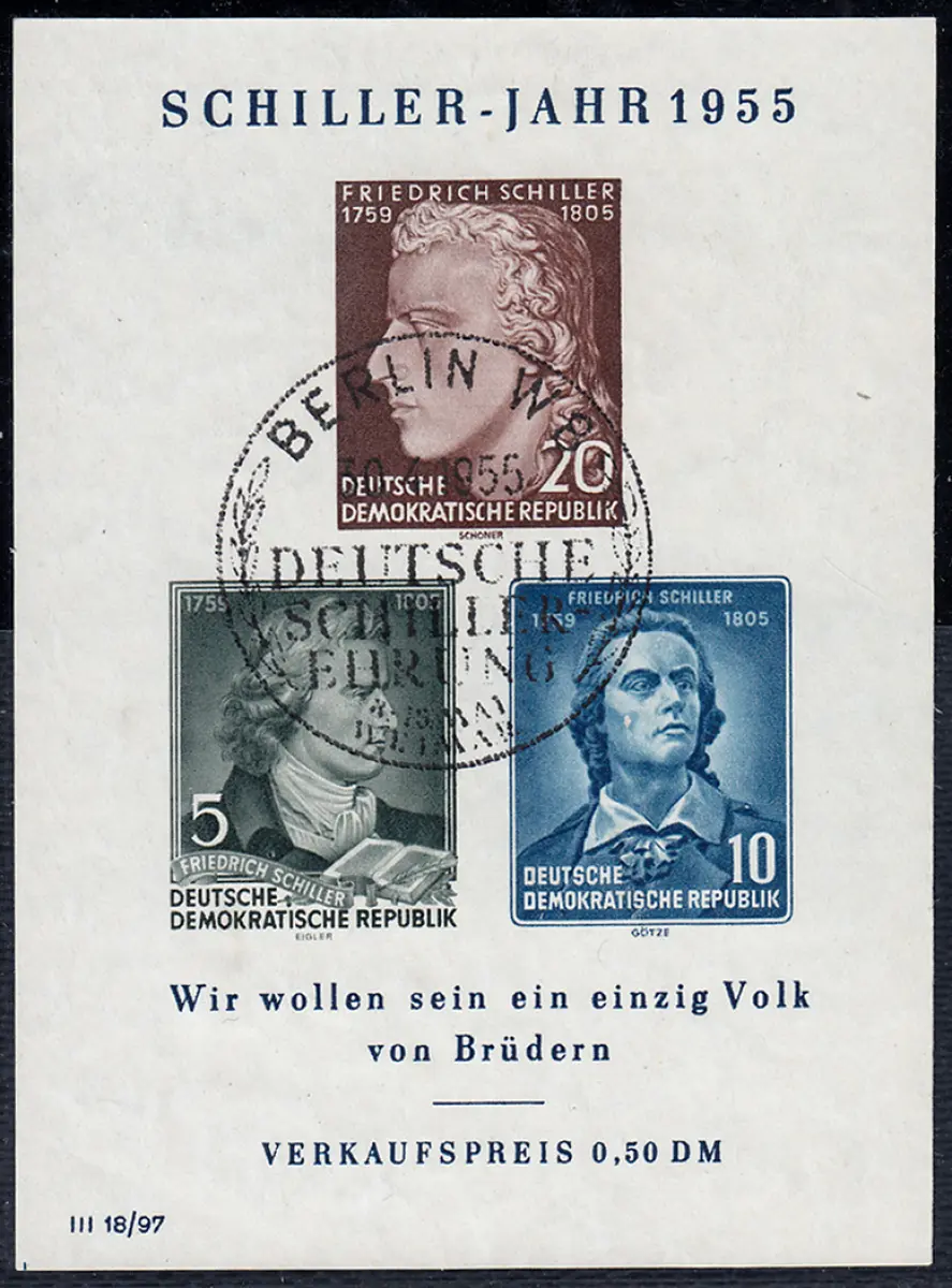 Schiller-Block mit MICHEL-Plattenfehler X: Abschlussserife des W in Wir rechts verlängert