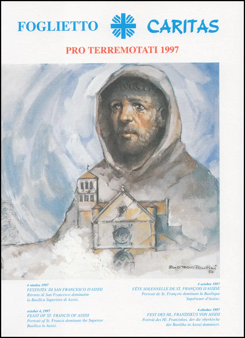 Blockausgabe mit rotem Aufdruck "PRO TERREMOTATI 1997" auf dem Blockrand für die Erdbebenhilfe im Folder FOGLIETTO CARITAS: Fest des Hl. Franziskus von Assisi