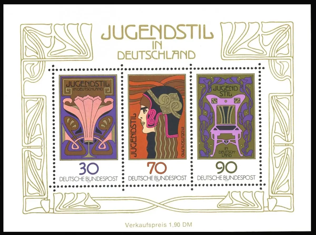 Block 14I Jugendstil 1977 mit PLF I Linienbruch beim 30-Pfennig-Wert, **